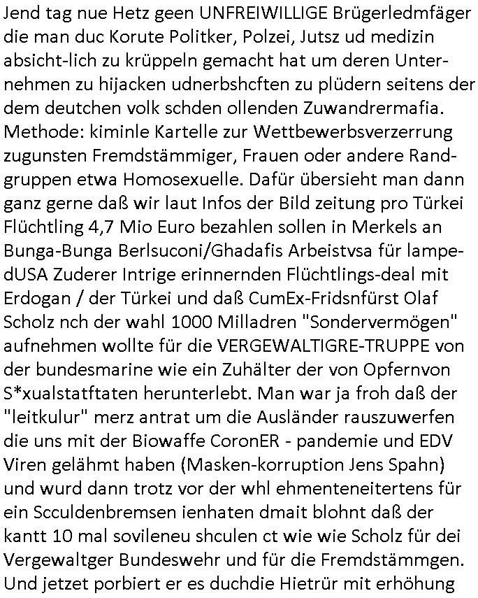 Jend tag nue Hetz geen UNFREIWILLIGE Brügerledmfäger die man duc Korute Politker, Polzei, Jutsz ud medizin absicht-lich zu krüppeln gemacht hat um deren Unter-nehmen zu hijacken udnerbshcften zu plüdern seitens der dem deutchen volk schden ollenden Zuwandrermafia. Methode: kiminle Kartelle zur Wettbewerbsverzerrung zugunsten Fremdstämmiger, Frauen oder andere Rand-gruppen etwa Homosexuelle. Dafür übersieht man dann ganz gerne daß wir laut Infos der Bild zeitung pro Türkei Flüchtling 4,7 Mio Euro bezahlen sollen in Merkels an Bunga-Bunga Berlsuconi/Ghadafis Arbeistvsa für lampe-dUSA Zuderer Intrige erinnernden Flüchtlings-deal mit Erdogan / der Türkei und daß CumEx-Fridsnfürst Olaf Scholz nch der wahl 1000 Milladren "Sondervermögen" aufnehmen wollte für die VERGEWALTIGRE-TRUPPE von der bundesmarine wie ein Zuhälter der von Opfernvon S*xualstatftaten herunterlebt. Man war ja froh daß der "leitkulur" merz antrat um die Ausländer rauszuwerfen die uns mit der Biowaffe CoronER - pandemie und EDV Viren gelähmt haben (Masken-korruption Jens Spahn) und wurd dann trotz vor der whl ehmenteneitertens für ein Scculdenbremsen ienhaten dmait blohnt daß der kantt 10 mal sovileneu shculen ct wie wie Scholz für dei Vergewaltger Bundeswehr und für die Fremdstämmgen. Und jetzet porbiert er es duchdie Hietrür mit erhöhung der Energiekosten (Was mcht der spritpreis seit dem iran kirge den israle angsettelt hat, jedes stcük brot,das im