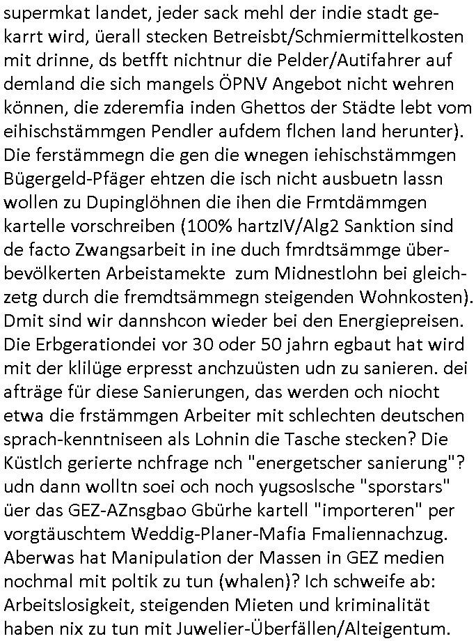supermkat landet, jeder sack mehl der indie stadt ge- karrt wird, üerall stecken Betreisbt/Schmiermittelkosten mit drinne, ds betfft nichtnur die Pelder/Autifahrer auf demland die sich mangels ÖPNV Angebot nicht wehren können, die zderemfia inden Ghettos der Städte lebt vom eihischstämmgen Pendler aufdem flchen land herunter). Die ferstämmegn die gen die wnegen iehischstämmgen Bügergeld-Pfäger ehtzen die isch nicht ausbuetn lassn wollen zu Dupinglöhnen die ihen die Frmtdämmgen kartelle vorschreiben (100% hartzIV/Alg2 Sanktion sind de facto Zwangsarbeit in ine duch fmrdtsämmge über-bevölkerten Arbeistamekte zum Midnestlohn bei gleich-zetg durch die fremdtsämmegn steigenden Wohnkosten). Dmit sind wir dannshcon wieder bei den Energiepreisen. Die Erbgerationdei vor 30 oder 50 jahrn egbaut hat wird mit der klilüge erpresst anchzuüsten udn zu sanieren. dei afträge für diese Sanierungen, das werden och niocht etwa die frstämmgen Arbeiter mit schlechten deutschen sprach-kenntniseen als Lohnin die Tasche stecken? Die Küstlch gerierte nchfrage nch "energetscher sanierung"? udn dann wolltn soei och noch yugsoslsche "sporstars" üer das GEZ-AZnsgbao Gbürhe kartell "importeren" per vorgtäuschtem Weddig-Planer-Mafia Fmaliennachzug. Aberwas hat Manipulation der Massen in GEZ medien nochmal mit poltik zu tun (whalen)? Ich schweife ab: Arbeitslosigkeit, steigenden Mieten und kriminalität haben nix zu tun mit Juwelier-Überfällen/Alteigentum.