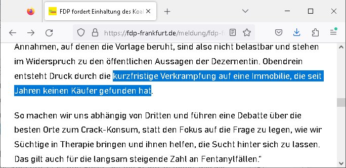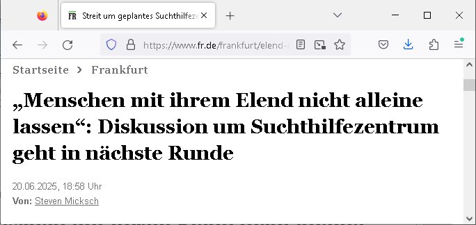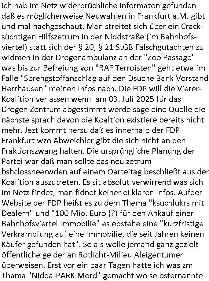Ich hab im Netz widerprüchliche Informaton gefunden daß es möglicherweise Neuwahlen in Frankfurt a.M. gibt und mal nachgeschaut. Man streitet sich über ein Crack-süchtigen Hilfszetrum in der Niddstraße (im Bahnhofs-viertel) statt sich der § 20, § 21 StGB Falschgutachten zu widmen in der Drogenambulanz an der "Zoo Passage" was bis zur Befreiung von "RAF Terroisten" geht etwa im Falle "Sprengstoffanschlag auf den Dsuche Bank Vorstand Herrhausen" meinen Infos nach. Die FDP will die Vierer-Koalition verlassen wenn am 03. Juli 2025 für das Drogen Zentrum abgestimmt werde sage eine Quelle die nächste sprach davon die Koaltion existiere bereits nicht mehr. Jezt kommt hersu daß es innerhalb der FDP Frankfurt wzo Abweichler gibt die sich nicht an den Fraktionszwang halten. Die ursprüngliche Planung der Partei war daß man sollte das neu zetrum bshclossneerwden auf einem Oarteitag beschließt aus der Koalition auszutreten. Es sit absolut verwirrend was sich im Netz findet, man fidnet keinerlei klaren Infos. Aufder Website der FDP heißt es zu dem Thema "ksuchlukrs mit Dealern" und "100 Mio. Euro (?) für den Ankauf einer Bahnhofsviertel Immobilie" es ebstehe eine "kurzfristige Verkrampfung auf eine Immobilie, die seit Jahren keinen Käufer gefunden hat". So als wolle jemand ganz gezielt öffentliche gelder an Rotlicht-Milieu Aleigentümer überweisen. Erst vor ein paar Tagen hatte ich was zm Thama "Nidda-PARK Mord" gemacht wo selbsternannte