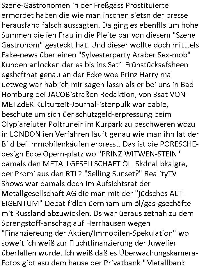 Szene-Gastronomen in der Freßgass Prostituierte ermordet haben die wie man inschen sietsn der presse herausfand falsch aussagten. Da ging es ebenflls um hohe Summen die ien Frau in die Pleite bar von diesem "Szene Gastronom" gesteckt hat. Und dieser wollte doch mitttels Fake-news über einen "Sylvesterparty Araber Sex-mob" Kunden anlocken der es bis ins Sat1 Frühstücksefsheen egshcfthat genau an der Ecke woe Prinz Harry mal uetweg war hab ich mir sagen lassn als er bei uns in Bad Homburg dei JACOBistraßen Redaktion, von 3sat VON-METZdER Kulturzeit-Journal-istenpulk war dabie, beschute um sich üer schutzgeld-erpressung beim Olypiareiuter Poltruneir im Kurpark zu beschweren wozu in LONDON ien Verfahren läuft genau wie man ihn lat der Bild bei Immobilenkäufen erpresst. Das ist die PORESCHE-design Ecke Opern-platz wo "PRINZ WITWEN-STEIN" damals den METALLGESELLSCHAFT ÖL Skdnal bkalgte, der Promi aus den RTL2 "Selling Sunset?" RealityTV Shows war damals doch im Aufsichtsrat der Metallgesellschaft AG die man mit der "jüdsches ALT-EIGENTUM" Debat fidlch üernham um öl/gas-gsechäfte mit Russland abzuwicklen. Ds war üeraus zetnah zu dem Sprengstoff-anschag auf Herrhausen wegen "Finanziereung der Aktien/Immobilen-Spekulation" wo soweit ich weiß zur Fluchtfinanzierung der Juwelier überfallen wurde. Ich weiß daß es Überwachungskamera-Fotos gibt asu dem hause der Privatbank "Metallbank