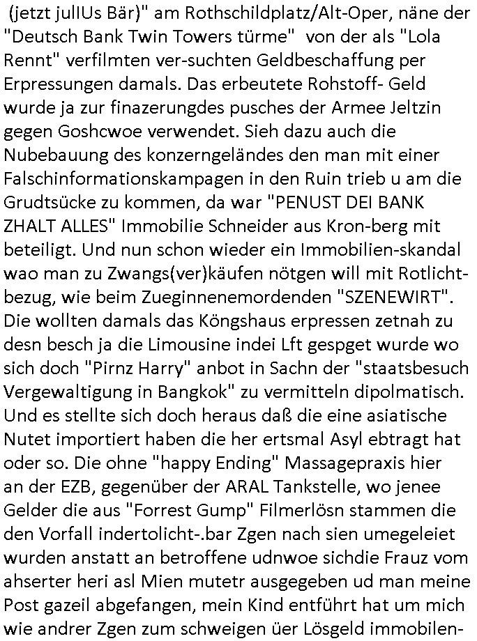 (jetzt julIUs Bär)" am Rothschildplatz/Alt-Oper, näne der "Deutsch Bank Twin Towers türme" von der als "Lola Rennt" verfilmten ver-suchten Geldbeschaffung per Erpressungen damals. Das erbeutete Rohstoff- Geld wurde ja zur finazerungdes pusches der Armee Jeltzin gegen Goshcwoe verwendet. Sieh dazu auch die Nubebauung des konzerngeländes den man mit einer Falschinformationskampagen in den Ruin trieb u am die Grudtsücke zu kommen, da war "PENUST DEI BANK ZHALT ALLES" Immobilie Schneider aus Kron-berg mit beteiligt. Und nun schon wieder ein Immobilien-skandal wao man zu Zwangs(ver)käufen nötgen will mit Rotlicht-bezug, wie beim Zueginnenemordenden "SZENEWIRT". Die wollten damals das Köngshaus erpressen zetnah zu desn besch ja die Limousine indei Lft gespget wurde wo sich doch "Pirnz Harry" anbot in Sachn der "staatsbesuc Vergewaltigung in Bangkok" zu vermitteln dipolmatisch. Und es stellte sich doch heraus daß die eine asiatische Nutet importiert haben die her ertsmal Asyl ebtragt hat oder so. Die ohne "happy Ending" Massagepraxis hier an der EZB, gegenüber der ARAL Tankstelle, wo jenee Gelder die aus "Forrest Gump" Filmerlösn stammen die den Vorfall indertolicht-.bar Zgen nach sien umegeleiet wurden anstatt an betroffene udnwoe sichdie Frauz vom ahserter heri asl Mien mutetr ausgegeben ud man meine Post gazeil abgefangen, mein Kind entführt hat um mich wie andrer Zgen zum schweigen üer Lösgeld immobilen-