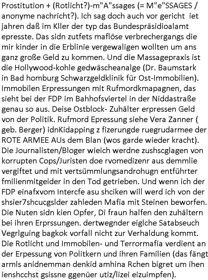 Prostitution + (Rotlicht?)-m"A"ssages (= M"e"SSAGES / anonyme nachricht?). Ich sag doch auch vor gericht iet jahren daß im Kller der typ das Bundespräsidioalamt epresste. Das sidn zutfets maflöse verbrechergangs die mir kinder in die Erblinie vergewaligen wollten um ans ganz große Geld zu kommen. Und die Massagepraxis ist die Hollywood-kohle gedwäscheanalge (Dr. Baumstark in Bad homburg Schwarzgeldklinik für Ost-Immobilien). Immobilen Erpressungen mit Rufmordkmapagnen, das sieht bei der FDP im Bahhofsviertel in der Niddastraße genau so aus. Deise Ostblock- Zuhälter erpressen Geld von der Politik. Rufmord Epressung siehe Vera Zanner ( geb. Berger) idnKidapping z fizerungde ruegrudarmee der ROTE ARMEE AUs dem Blan (wos garde wieder kracht). Die Journalisten/Bloger wieich werdne zushscglagen von korrupten Cops/Juristen doe rvomedizenr aus demmlie vergiftet und mit vertsümmlungsandrohugn entführter fmilienmitgeider in den Tod getrieben. Und wenn ich der FDP einafxvom Intercfe asu shciken will werd ich von der shsier7shcucgslder zahleden Mafia mit Steinen beworfen. Die Nuten sidn kien Opfer, Di fraun halfen den zuhältern bei ihren Erprssungen. dertwegnder eiglche Satabseuch Vegrlguing bagkok vorfall nicht zur Verhaldung kommt. Die Rotlicht und Immobilen- und Terrormafia verdient an der Erpessung von Politkern und ihren Familien (das fängt armls anidnemman denkid amhina Rchen bigret um ihen ienshcchst gsissne ggenüer utiz/lizei eizuimpfen).