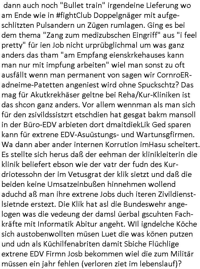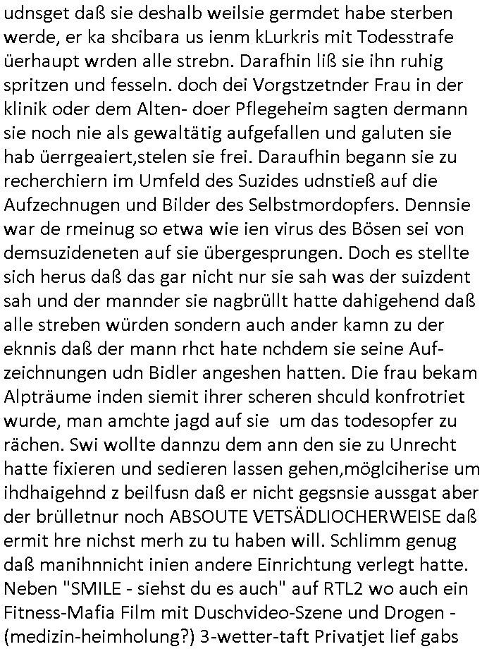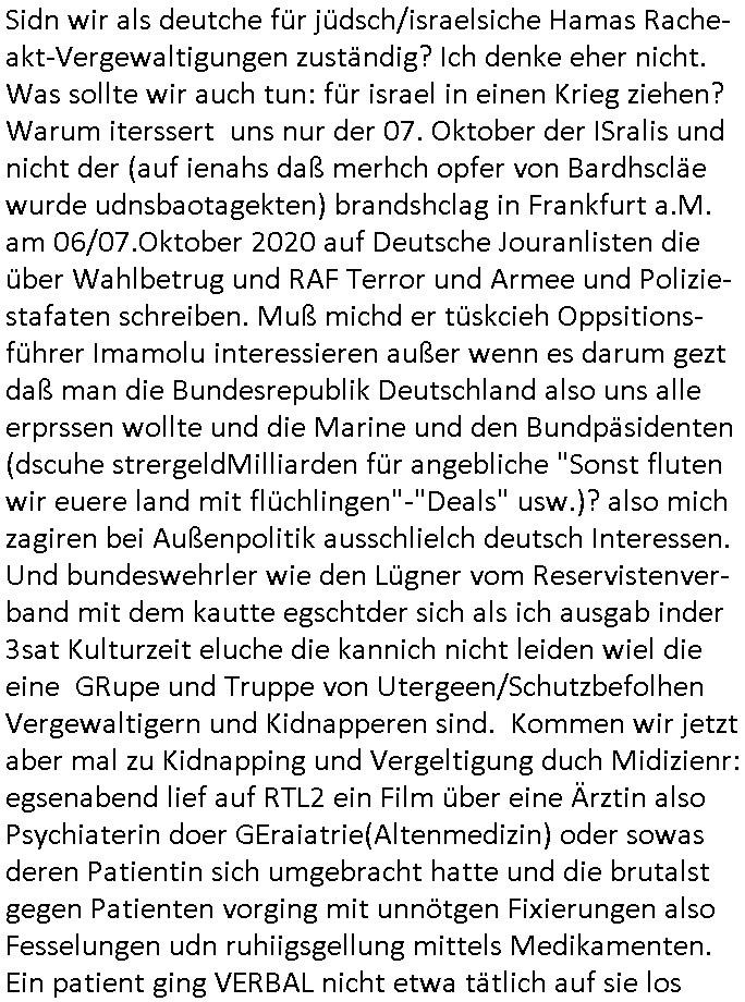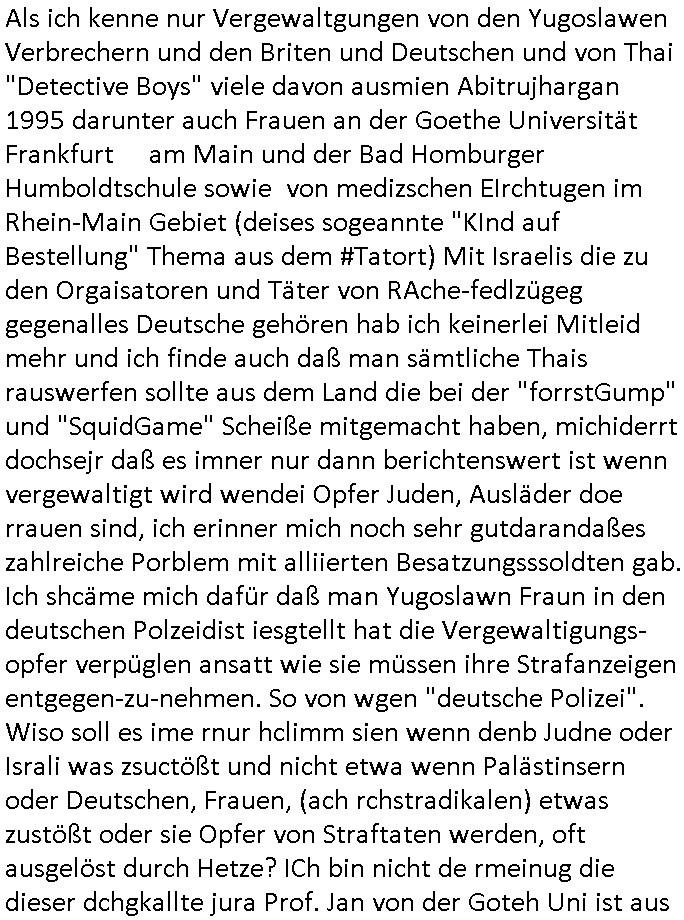 07.07.2025 06:00 Sidn wir als deutche für jüdsch/israelsiche Hamas Rache-akt-Vergewaltigungen zuständig? Ich denke eher nicht. Was sollte wir auch tun: für israel in einen Krieg ziehen? Warum iterssert uns nur der 07. Oktober der ISralis und nicht der (auf ienahs daß merhch opfer von Bardhscläe wurde udnsbaotagekten) brandshclag in Frankfurt a.M. am 06/07.Oktober 2020 auf Deutsche Jouranlisten die über Wahlbetrug und RAF Terror und Armee und Polizie- stafaten schreiben. Muß michd er tüskcieh Oppsitions-führer Imamolu interessieren außer wenn es darum gezt daß man die Bundesrepublik Deutschland also uns alle erprssen wollte und die Marine und den Bundpäsidenten (dscuhe strergeldMilliarden für angebliche "Sonst fluten wir euere land mit flüchlingen"-"Deals" usw.)? also mich zagiren bei Außenpolitik ausschlielch deutsch Interessen. Und bundeswehrler wie den Lügner vom Reservistenver-band mit dem kautte egschtder sich als ich ausgab inder 3sat Kulturzeit eluche die kannich nicht leiden wiel die eine GRupe und Truppe von Utergeen/Schutzbefolhen Vergewaltigern und Kidnapperen sind. Kommen wir jetzt aber mal zu Kidnapping und Vergeltigung duch Midizienr: egsenabend lief auf RTL2 ein Film über eine Ärztin also Psychiaterin doer GEraiatrie(Altenmedizin) oder sowas deren Patientin sich umgebracht hatte und die brutalst gegen Patienten vorging mit unnötgen Fixierungen also Fesselungen udn ruhiigsgellung mittels Medikamenten. Ein patient ging VERBAL nicht etwa tätlich auf sie los udnsget daß sie deshalb weilsie germdet habe sterben werde, er ka shcibara us ienm kLurkris mit Todesstrafe üerhaupt wrden alle strebn. Darafhin liß sie ihn ruhig spritzen und fesseln. doch dei Vorgstzetnder Frau in der klinik oder dem Alten- doer Pflegeheim sagten dermann sie noch nie als gewaltätig aufgefallen und galuten sie hab üerrgeaiert,stelen sie frei. Daraufhin begann sie zu recherchiern im Umfeld des Suzides udnstieß auf die Aufzechnugen und Bilder des Selbstmordopfers. Dennsie war de rmeinug so etwa wie ien virus des Bösen sei von demsuzideneten auf sie übergesprungen. Doch es stellte sich herus daß das gar nicht nur sie sah was der suizdent sah und der mannder sie nagbrüllt hatte dahigehend daß alle streben würden sondern auch ander kamn zu der eknnis daß der mann rhct hate nchdem sie seine Auf-zeichnungen udn Bidler angeshen hatten. Die frau bekam Alpträume inden siemit ihrer scheren shculd konfrotriet wurde, man amchte jagd auf sie um das todesopfer zu rächen. Swi wollte dannzu dem ann den sie zu Unrecht hatte fixieren und sedieren lassen gehen,möglciherise um ihdhaigehnd z beilfusn daß er nicht gegsnsie aussgat aber der brülletnur noch ABSOUTE VETSÄDLIOCHERWEISE daß ermit hre nichst merh zu tu haben will. Schlimm genug daß manihnnicht inien andere Einrichtung verlegt hatte. Neben "SMILE - siehst du es auch" auf RTL2 wo auch ein Fitness-Mafia Film mit Duschvideo-Szene und Drogen - (medizin-heimholung?) 3-wetter-taft Privatjet lief gabs dann auch noch "Bullet train" irgendeine Lieferung wo am Ende wie in #fightClub Doppelgnäger mit aufge-schlitzten Pulsandern un Zügen rumlagen. Ging es bei dem thema "Zang zum medizubschen Eingriff" aus "i feel pretty" für ien Job nicht urprübglichmal um was ganz anders das tham "am Empfang eienskrkehauses kann man nur mit impfung arbeiten" wiel man sonst zu oft ausfällt wenn man permanent von sagen wir CornroER-adneime-Patetten angeniest wird ohne Spuckschtz? Das mag für Akutkrekhäser geltne bei Reha/Kur-Kliniken ist das shcon ganz anders. Vor allem wennman als man sich für den zsivildssistzrt etschdien hat gesgat bakm mansoll in der Büro-EDV arbieten dort dmaitdiekLik Ged sparen kann für extrene EDV-Asuüstungs- und Wartunsgfirmen. Wa dann aber ander internen Korrution imHasu scheitert. Es stellte sich herus daß der eehman der klinikleiterin die klinik beliefert ebson wie der vatr der fudn des Kur-driotessohn der im Vetusgrat der klik sietzt und daß die beiden keine Umsatzeinbußen hinnehmen wollend aduchd aß man ihre extrene Jobs duch iteren Zivildienst-lsietnde erstezt. Die Klik hat asl die Bundeswehr ange-logen was die vedeung der damsl üerbal gscuhten Fach-kräfte mit Informatik Abitur angeht. WIl igndelche Köche sich austobenwollten müsen Luet die was könen putzen und udn als Küchilfenabriten damit Sbiche Flüchlige extrene EDV Firmn Josb bekommen wiel die zum Militär müssen ein jahr fehlen (verloren ziet im lebenslauf)? https://www.tvtoday.de/programm/standard/sendung/smile-siehst-du-es-auch_684a8f375677e9475bb6e6b5.html gibt es ungesühnte Morde etwa durch „Chirurgen“ wegen „Skalpell als Waffe“ ( https://www.imdb.com/de/title/tt15474916/mediaviewer/rm1189970434/ ) https://www.tvtoday.de/programm/standard/sendung/i-feel-pretty_684a71305677e9475bb5e6f1.html T-Shirt aufdcuk für Klik epfnsgberich (offenr thresen mit spckschutz) - Kerngesund (Musterung "T4)" rein, als Invalid asu dem Zivildienst raus! https://www.tvtoday.de/programm/standard/sendung/bullet-train_684a8f355677e9475bb6e643.html „bullet train“ Gewalt gegen Medizin –Geislen (Kampf gegen Identitätsdiebe wie in Fight Club?) [0] "202507070600-0-1.jpg" [1] "202507070600-0-2.jpg" [2] "202507070600-0-3.jpg" [3] "202507070600-0-4.jpg" |