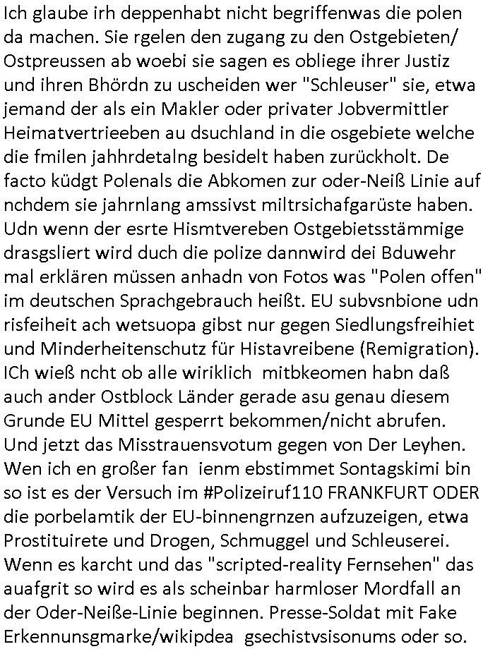 07.07.2025 07:00 Am Samstag abend gab es eine hochinteressante ZDFInfo Doku wo es um Gräuelaten der Polen an der deutschen Minder-heit ging die zum Ausbruchc des zwoten weltkriegs führte nur mal so am Rande weil ich mich mal mit der Frage von (un-)"bestätigten Abschüssen" von Flugzeugen und von "be-stätigten Toten" beschäftgt habe was folglich bdezet daß es auch "un-bestätigte Tote" sind (siehe Prof. Boerne #Tatort Limbus) gestren im "Claire-Schlamm, wobei Cläre mit A-umlaut gschiebn ist" Video. Jedfalls hiße esd a daß @SteinbachErika1 recht hatte mit der behauptung Polen habe zurest mobil gemacht und Deutschland darauf reagiert. WIkipdei ist voler fherl shcibe ja ahc die Frakfurter Allgemeine Sonntaszetung. Ich fidne die bduwehr sollte mal ein paar Kriegs-Schiffe an dei plnsiche Ostessgreze vrlegen umdiese zu shcützen. Die staten ja iege Gerzkotollen gegen angliche schleuser die mschen von Dsuchlan dnch Polens hclsuensolln, ist das denn so ien hochlohnland inzwischen oder gibt es da mahr soszallsitugen als hier oder im BRexit gebiete für Asylsuchende asu Drittstaaten (Die Lampdusa Libyer dene BErluscon EU Abristvias für dei erhife ausstelken wollte?) und noch was: a poprs cklären: wenn der ostblock kriegs-erklärugen vsden will sollete r sichd abi besser nicht auf plsnche BIGFAx etchnik valssen dannkomen die nämlich nicht an (hete rst gstohlen ...) und es gibt ein neues "stumbling ...to pearl harbour without warning (they offer [IRDA] infrarde instead of SUN (microsystems)". Ich glaube irh deppenhabt nicht begriffenwas die polen da machen. Sie rgelen den zugang zu den Ostgebieten/ Ostpreussen ab woebi sie sagen es obliege ihrer Justiz und ihren Bhördn zu uscheiden wer "Schleuser" sie, etwa jemand der als ein Makler oder privater Jobvermittler Heimatvertrieeben au dsuchland in die osgebiete welche die fmilen jahhrdetalng besidelt haben zurückholt. De facto küdgt Polenals die Abkomen zur oder-Neiß Linie auf nchdem sie jahrnlang amssivst miltrsichafgarüste haben. Udn wenn der esrte Hismtvereben Ostgebietsstämmige drasgsliert wird duch die polize dannwird dei Bduwehr mal erklären müssen anhadn von Fotos was "Polen offen" im deutschen Sprachgebrauch heißt. EU subvsnbione udn risfeiheit ach wetsuopa gibst nur gegen Siedlungsfreihiet und Minderheitenschutz für Histavreibene (Remigration). ICh wieß ncht ob alle wiriklich mitbkeomen habn daß auch ander Ostblock Länder gerade asu genau diesem Grunde EU Mittel gesperrt bekommen/nicht abrufen. Und jetzt das Misstrauensvotum gegen von Der Leyhen. Wen ich en großer fan ienm ebstimmet Sontagskimi bin so ist es der Versuch im #Polizeiruf110 FRANKFURT ODER die porbelamtik der EU-binnengrnzen aufzuzeigen, etwa Prostituirete und Drogen, Schmuggel und Schleuserei. Wenn es karcht und das "scripted-reality Fernsehen" das auafgrit so wird es als scheinbar harmloser Mordfall an der Oder-Neiße-Linie beginnen. Presse-Soldat mit Fake Erkennunsgmarke/wikipdea gsechistvsisonums oder so. https://www.tvinfo.de/fernsehprogramm/2151283391-der-zweite-weltkrieg https://www.tvinfo.de/fernsehprogramm/2151283393-der-zweite-weltkrieg https://www.tvinfo.de/fernsehprogramm/2151283395-der-zweite-weltkrieg https://www.rbb24.de/politik/beitrag/2025/07/polen-grenzkontrollen-beginn-staus-a12.html https://www.tagesschau.de/ausland/europa/brandbrief-eu-ungarn-100.html https://de.quora.com/Was-genau-ist-eine-best%C3%A4tigte-und-eine-unbest%C3%A4tigte-T%C3%B6tung-Wie-werden-Scharfsch%C3%BCtzent%C3%B6tungen-best%C3%A4tigt-Brauchst-du-eine-Leiche-als-Beweis-Muss-ein-anderer-Soldat-Zeuge-des-Mordes-werden https://www.tagesschau.de/ausland/europa/ukraine-russland-austausch-100.html (1.200 Leichen: Tiere oder Menschen?) https://www.faz.net/aktuell/wirtschaft/wikipedia-ist-nicht-mehr-aktuell-und-hat-viele-fehler-110575350.html https://de.wikipedia.org/wiki/Polizeiruf_110_(%C5%9Awiecko) https://de.wikipedia.org/wiki/Tatort:_Limbus [0] "202507070700-0-1.jpg" [1] "202507070700-0-2.jpg" [2] "202507070700-0-3.jpg" [3] "202507070700-0-4.jpg" [4] "202507070700-0-5.jpg" |