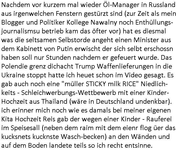 07.07.2025 17:00 Nachdem vor kurzem mal wieder Öl-Manager in Russland aus irgenwelchen Fenstern gestürzt sind (zur Zeit als mein Blogger und Politiker Kollege Nawalny noch Enthüllungs-journalismsu betrieb kam das öfter vor) hat es diesmal was die seltsamen Selbstorde angeht einen Minister aus dem Kabinett von Putin erwischt der sich selbt erschossn haben soll nur Stunden nachdem er gefeuert wurde. Das Polendie grenz dichacht Trump Waffenlieferungen in die Ukraine stoppt hatte ich heuet schon im Video gesagt. Es gab auch noch eine "müller STICKY milk RICE" Niedlich-keits - Schleichwerbungs-Wettbewerb mit einer Kinder- Hochzeit aus Thailand (wäre in Deutschland undenkbar). ich erinner mich noch wie es damals bei meiner eigenen Kita Hochzeit Reis gab der wegen einer Kinder - Rauferei im Speisesall (neben dem raim mit dem eienr flog üer das kucksnets kucknste Wasch-becken) an den Wänden und auf dem Boden landete teils so ich recht entsinne. https://www.bild.de/leben-wissen/lifestyle/seltsames-ritual-in-thailand-hier-werden-geschwister-verheiratet-686a2945d009353a0c961660 https://www.bild.de/politik/sechs-stunden-nachdem-putin-ihn-feuerte-russen-verkehrsminister-tot-aufgefunden-686bcfcd98601a3392661189 https://www.bild.de/politik/ausland-und-internationales/ukraine-krieg-trump-stoppt-wichtige-waffenlieferungen-an-kiew-6864b89f0e5e9466640ea1ec https://de.wikipedia.org/wiki/Klebreis [0] "202507071700-0-1.jpg" [1] "202507071700-0-2.jpg" |