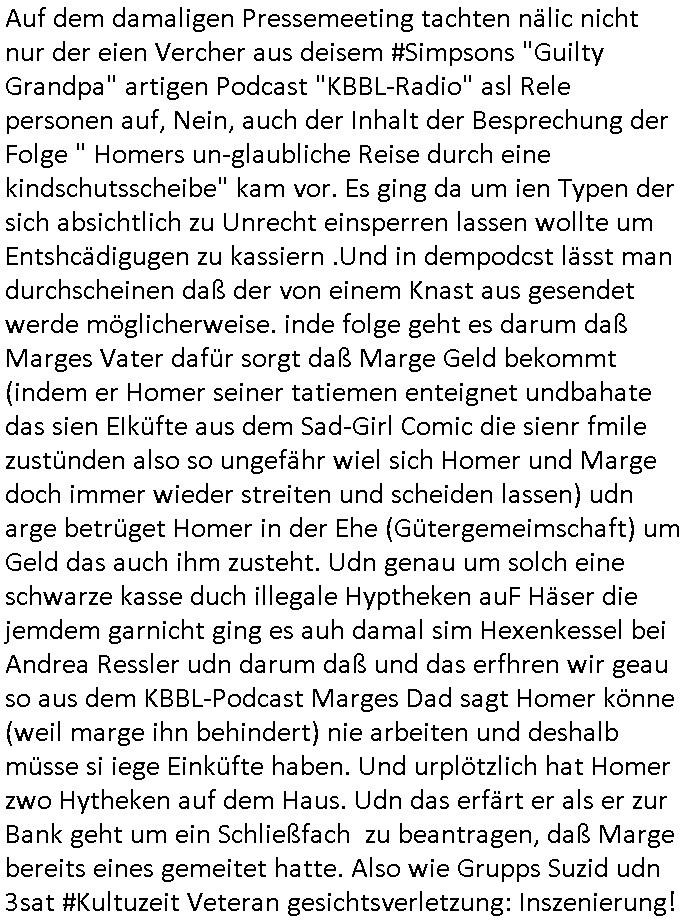 Auf dem damaligen Pressemeeting tachten nälic nicht nur der eien Vercher aus deisem #Simpsons "Guilty Grandpa" artigen Podcast "KBBL-Radio" asl Rele personen auf, Nein, auch der Inhalt der Besprechung der Folge " Homers un-glaubliche Reise durch eine kindschutsscheibe" kam vor. Es ging da um ien Typen der sich absichtlich zu Unrecht einsperren lassen wollte um Entshcädigugen zu kassiern .Und in dempodcst lässt man durchscheinen daß der von einem Knast aus gesendet werde möglicherweise. inde folge geht es darum daß Marges Vater dafür sorgt daß Marge Geld bekommt (indem er Homer seiner tatiemen enteignet undbahate das sien EIküfte aus dem Sad-Girl Comic die sienr fmile zustünden also so ungefähr wiel sich Homer und Marge doch immer wieder streiten und scheiden lassen) udn arge betrüget Homer in der Ehe (Gütergemeimschaft) um Geld das auch ihm zusteht. Udn genau um solch eine schwarze kasse duch illegale Hyptheken auF Häser die jemdem garnicht ging es auh damal sim Hexenkessel bei Andrea Ressler udn darum daß und das erfhren wir geau so aus dem KBBL-Podcast Marges Dad sagt Homer könne (weil marge ihn behindert) nie arbeiten und deshalb müsse si iege Einküfte haben. Und urplötzlich hat Homer zwo Hytheken auf dem Haus. Udn das erfärt er als er zur Bank geht um ein Schließfach zu beantragen, daß Marge bereits eines gemeitet hatte. Also wie Grupps Suzid udn 3sat #Kultuzeit Veteran gesichtsverletzung: Inszenierung!