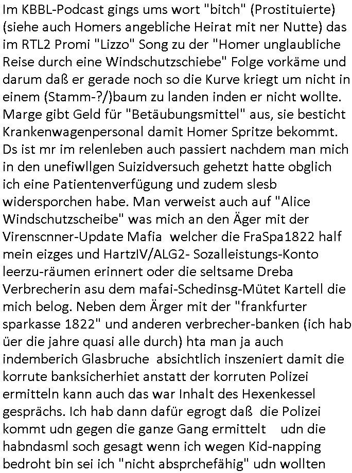 Im KBBL-Podcast gings ums wort "bitch" (Prostituierte) (siehe auch Homers angebliche Heirat mit ner Nutte) das im RTL2 Promi "Lizzo" Song zu der "Homer unglaubliche Reise durch eine Windschutzschiebe" Folge vorkäme und darum daß er gerade noch so die Kurve kriegt um nicht in einem (Stamm-?/)baum zu landen inden er nicht wollte. Marge gibt Geld für "Betäubungsmittel" aus, sie besticht Krankenwagenpersonal damit Homer Spritze bekommt. Ds ist mr im relenleben auch passiert nachdem man mich in den unefiwllgen Suizidversuch gehetzt hatte obglich ich eine Patientenverfügung und zudem slesb widersporchen habe. Man verweist auch auf "Alice Windschutzscheibe" was mich an den Äger mit der Virenscnner-Update Mafia welcher die FraSpa1822 half mein eizges und HartzIV/ALG2- Sozalleistungs-Konto leerzu-räumen erinnert oder die seltsame Dreba Verbrecherin asu dem mafai-Schedinsg-Mütet Kartell die mich belog. Neben dem Ärger mit der "frankfurter sparkasse 1822" und anderen verbrecher-banken (ich hab üer die jahre quasi alle durch) hta man ja auch indemberich Glasbruche absichtlich inszeniert damit die korrute banksicherhiet anstatt der korruten Polizei ermitteln kann auch das war Inhalt des Hexenkessel gesprächs. Ich hab dann dafür egrogt daß die Polizei kommt udn gegen die ganze Gang ermittelt udn die habndasml soch gesagt wenn ich wegen Kid-napping bedroht bin sei ich "nicht absprchefähig" udn wollten