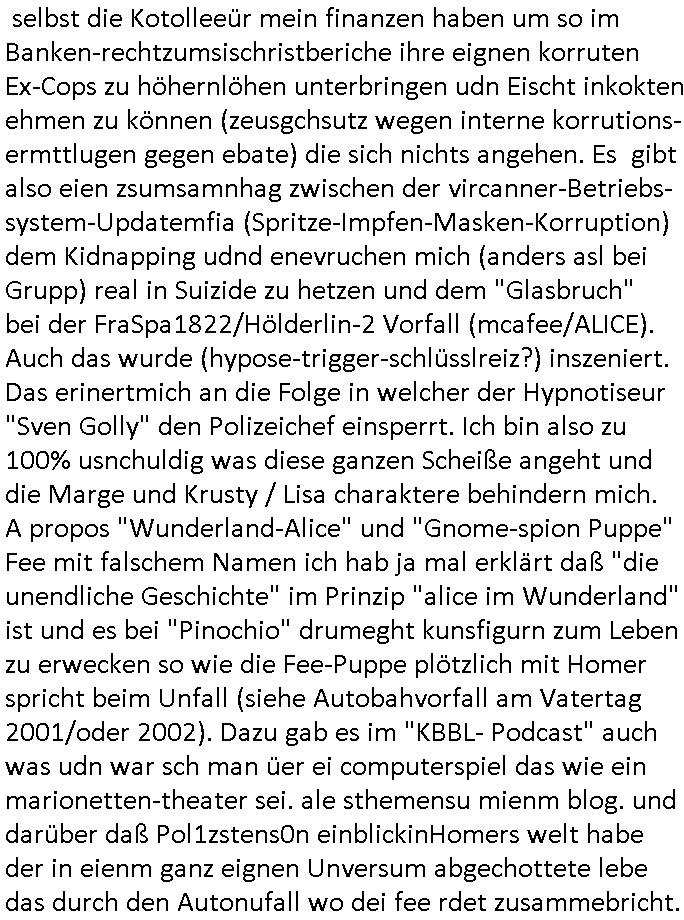 selbst die Kotolleeür mein finanzen haben um so im Banken-rechtzumsischristberiche ihre eignen korruten Ex-Cops zu höhernlöhen unterbringen udn Eischt inkokten ehmen zu können (zeusgchsutz wegen interne korrutions-ermttlugen gegen ebate) die sich nichts angehen. Es gibt also eien zsumsamnhag zwischen der vircanner-Betriebs-system-Updatemfia (Spritze-Impfen-Masken-Korruption) dem Kidnapping udnd enevruchen mich (anders asl bei Grupp) real in Suizide zu hetzen und dem "Glasbruch" bei der FraSpa1822/Hölderlin-2 Vorfall (mcafee/ALICE). Auch das wurde (hypose-trigger-schlüsslreiz?) inszeniert. Das erinertmich an die Folge in welcher der Hypnotiseur "Sven Golly" den Polizeichef einsperrt. Ich bin also zu 100% usnchuldig was diese ganzen Scheiße angeht und die Marge und Krusty / Lisa charaktere behindern mich. A propos "Wunderland-Alice" und "Gnome-spion Puppe" Fee mit falschem Namen ich hab ja mal erklärt daß "die unendliche Geschichte" im Prinzip "alice im Wunderland" ist und es bei "Pinochio" drumeght kunsfigurn zum Leben zu erwecken so wie die Fee-Puppe plötzlich mit Homer spricht beim Unfall (siehe Autobahvorfall am Vatertag 2001/oder 2002). Dazu gab es im "KBBL- Podcast" auch was udn war sch man üer ei computerspiel das wie ein marionetten-theater sei. ale sthemensu mienm blog. und darüber daß Pol1zstens0n einblickinHomers welt habe der in eienm ganz eignen Unversum abgechottete lebe das durch den Autonufall wo dei fee rdet zusammebricht.