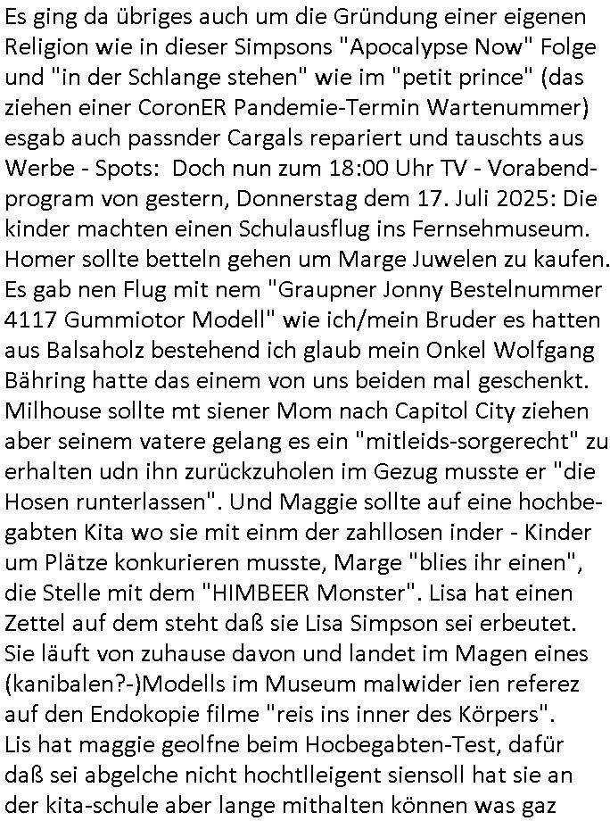 Es ging da übriges auch um die Gründung einer eigenen Religion wie in dieser Simpsons "Apocalypse Now" Folge und "in der Schlange stehen" wie im "petit prince" (das ziehen einer CoronER Pandemie-Termin Wartenummer) esgab auch passnder Cargals repariert und tauschts aus Werbe - Spots: Doch nun zum 18:00 Uhr TV - Vorabend-program von gestern, Donnerstag dem 17. Juli 2025: Die kinder machten einen Schulausflug ins Fernsehmuseum. Homer sollte betteln gehen um Marge Juwelen zu kaufen. Es gab nen Flug mit nem "Graupner Jonny Bestelnummer 4117 Gummiotor Modell" wie ich/mein Bruder es hatten aus Balsaholz bestehend ich glaub mein Onkel Wolfgang Bähring hatte das einem von uns beiden mal geschenkt. Milhouse sollte mt siener Mom nach Capitol City ziehen aber seinem vatere gelang es ein "mitleids-sorgerecht" zu erhalten udn ihn zurückzuholen im Gezug musste er "die Hosen runterlassen". Und Maggie sollte auf eine hochbe-gabten Kita wo sie mit einm der zahllosen inder - Kinder um Plätze konkurieren musste, Marge "blies ihr einen", die Stelle mit dem "HIMBEER Monster". Lisa hat einen Zettel auf dem steht daß sie Lisa Simpson sei erbeutet. Sie läuft von zuhause davon und landet im Magen eines (kanibalen?-)Modells im Museum malwider ien referez auf den Endokopie filme "reis ins inner des Körpers". Lis hat maggie geolfne beim Hocbegabten-Test, dafür daß sei abgelche nicht hochtlleigent siensoll hat sie an der kita-schule aber lange mithalten können was gaz