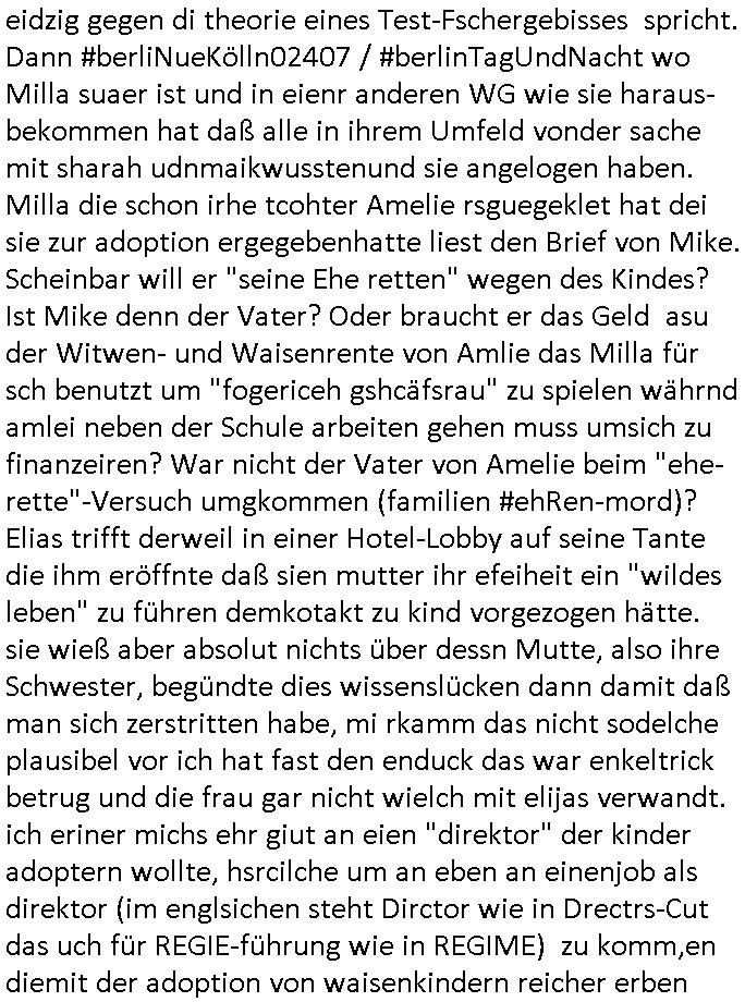 eidzig gegen di theorie eines Test-Fschergebisses spricht. Dann #berliNueKölln02407 / #berlinTagUndNacht wo Milla suaer ist und in eienr anderen WG wie sie haraus-bekommen hat daß alle in ihrem Umfeld vonder sache mit sharah udnmaikwusstenund sie angelogen haben. Milla die schon irhe tcohter Amelie rsguegeklet hat dei sie zur adoption ergegebenhatte liest den Brief von Mike. Scheinbar will er "seine Ehe retten" wegen des Kindes? Ist Mike denn der Vater? Oder braucht er das Geld asu der Witwen- und Waisenrente von Amlie das Milla für sch benutzt um "fogericeh gshcäfsrau" zu spielen währnd amlei neben der Schule arbeiten gehen muss umsich zu finanzeiren? War nicht der Vater von Amelie beim "ehe-rette"-Versuch umgkommen (familien #ehRen-mord)? Elias trifft derweil in einer Hotel-Lobby auf seine Tante die ihm eröffnte daß sien mutter ihr efeiheit ein "wildes leben" zu führen demkotakt zu kind vorgezogen hätte. sie wieß aber absolut nichts über dessn Mutte, also ihre Schwester, begündte dies wissenslücken dann damit daß man sich zerstritten habe, mi rkamm das nicht sodelche plausibel vor ich hat fast den enduck das war enkeltrick betrug und die frau gar nicht wielch mit elijas verwandt. ich eriner michs ehr giut an eien "direktor" der kinder adoptern wollte, hsrcilche um an eben an einenjob als direktor (im englsichen steht Dirctor wie in Drectrs-Cut das uch für REGIE-führung wie in REGIME) zu komm,en diemit der adoption von waisenkindern reicher erben