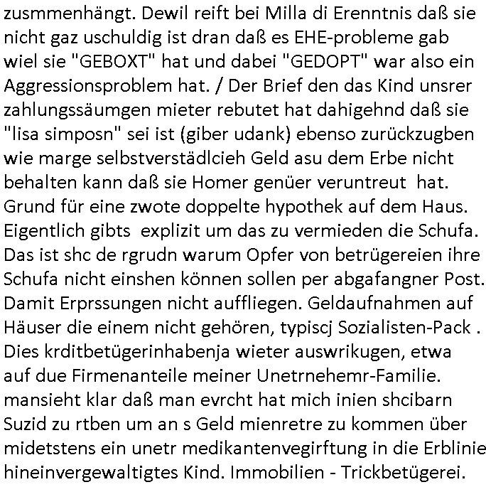 zusmmenhängt. Dewil reift bei Milla di Erenntnis daß sie nicht gaz uschuldig ist dran daß es EHE-probleme gab wiel sie "GEBOXT" hat und dabei "GEDOPT" war also ein Aggressionsproblem hat. / Der Brief den das Kind unsrer zahlungssäumgen mieter rebutet hat dahigehnd daß sie "lisa simposn" sei ist (giber udank) ebenso zurückzugben wie marge selbstverstädlcieh Geld asu dem Erbe nicht behalten kann daß sie Homer genüer veruntreut hat. Grund für eine zwote doppelte hypothek auf dem Haus. Eigentlich gibts explizit um das zu vermieden die Schufa. Das ist shc de rgrudn warum Opfer von betrügereien ihre Schufa nicht einshen können sollen per abgafangner Post. Damit Erprssungen nicht auffliegen. Geldaufnahmen auf Häuser die einem nicht gehören, typiscj Sozialisten-Pack . Dies krditbetügerinhabenja wieter auswrikugen, etwa auf due Firmenanteile meiner Unetrnehemr-Familie. mansieht klar daß man evrcht hat mich inien shcibarn Suzid zu rtben um an s Geld mienretre zu kommen über midetstens ein unetr medikantenvegirftung in die Erblinie hineinvergewaltigtes Kind. Immobilien - Trickbetügerei.