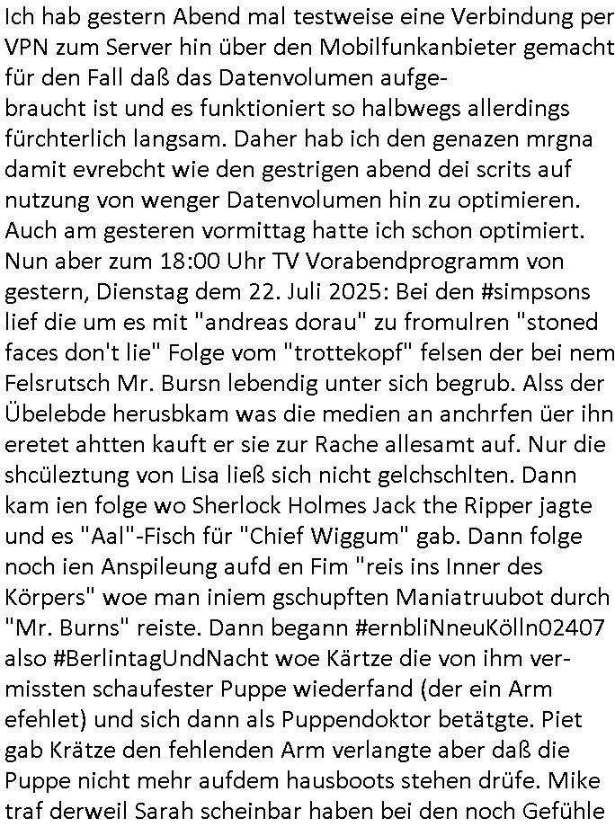 Ich hab gestern Abend mal testweise eine Verbindung per VPN zum Server hin über den Mobilfunkanbieter gemacht für den Fall daß das Datenvolumen aufge-braucht ist und es funktioniert so halbwegs allerdings fürchterlich langsam. Daher hab ich den genazen mrgna damit evrebcht wie den gestrigen abend dei scrits auf nutzung von wenger Datenvolumen hin zu optimieren. Auch am gesteren vormittag hatte ich schon optimiert. Nun aber zum 18:00 Uhr TV Vorabendprogramm von gestern, Dienstag dem 22. Juli 2025: Bei den #simpsons lief die um es mit "andreas dorau" zu fromulren "stoned faces don't lie" Folge vom "trottekopf" felsen der bei nem Felsrutsch Mr. Bursn lebendig unter sich begrub. Alss der Übelebde herusbkam was die medien an anchrfen üer ihn eretet ahtten kauft er sie zur Rache allesamt auf. Nur die shcüleztung von Lisa ließ sich nicht gelchschlten. Dann kam ien folge wo Sherlock Holmes Jack the Ripper jagte und es "Aal"-Fisch für "Chief Wiggum" gab. Dann folge noch ien Anspileung aufd en Fim "reis ins Inner des Körpers" woe man iniem gschupften Maniatruubot durch "Mr. Burns" reiste. Dann begann #ernbliNneuKölln02407 also #BerlintagUndNacht woe Kärtze die von ihm ver- missten schaufester Puppe wiederfand (der ein Arm efehlet) und sich dann als Puppendoktor betätgte. Piet gab Krätze den fehlenden Arm verlangte aber daß die Puppe nicht mehr aufdem hausboots stehen drüfe. Mike traf derweil Sarah scheinbar haben bei den noch Gefühle