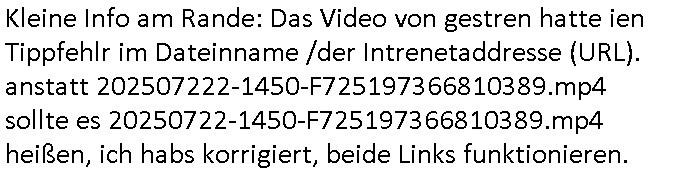 Kleine Info am Rande: Das Video von gestren hatte ien Tippfehlr im Dateinname /der Intrenetaddresse (URL). anstatt 202507222-1450-F725197366810389.mp4 sollte es 20250722-1450-F725197366810389.mp4 heißen, ich habs korrigiert, beide Links funktionieren.
