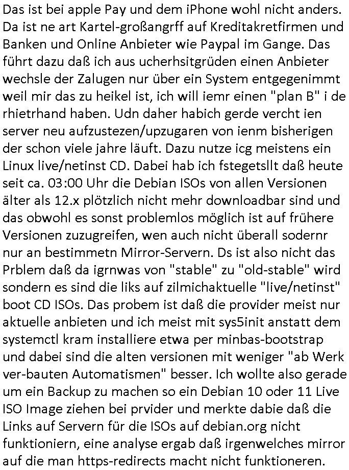 Das ist bei apple Pay und dem iPhone wohl nicht anders. Da ist ne art Kartel-großangrff auf Kreditakretfirmen und Banken und Online Anbieter wie Paypal im Gange. Das führt dazu daß ich aus ucherhsitgrüden einen Anbieter wechsle der Zalugen nur über ein System entgegenimmt weil mir das zu heikel ist, ich will iemr einen "plan B" i de rhietrhand haben. Udn daher habich gerde vercht ien server neu aufzustezen/upzugaren von ienm bisherigen der schon viele jahre läuft. Dazu nutze icg meistens ein Linux live/netinst CD. Dabei hab ich fstegetsllt daß heute seit ca. 03:00 Uhr die Debian ISOs von allen Versionen älter als 12.x plötzlich nicht mehr downloadbar sind und das obwohl es sonst problemlos möglich ist auf frühere Versionen zuzugreifen, wen auch nicht überall sodernr nur an bestimmetn Mirror-Servern. Ds ist also nicht das Prblem daß da igrnwas von "stable" zu "old-stable" wird sondern es sind die liks auf zilmichaktuelle "live/netinst" boot CD ISOs. Das probem ist daß die provider meist nur aktuelle anbieten und ich meist mit sys5init anstatt dem systemctl kram installiere etwa per minbas-bootstrap und dabei sind die alten versionen mit weniger "ab Werk ver-bauten Automatismen" besser. Ich wollte also gerade um ein Backup zu machen so ein Debian 10 oder 11 Live ISO Image ziehen bei prvider und merkte dabie daß die Links auf Servern für die ISOs auf debian.org nicht funktioniern, eine analyse ergab daß irgenwelches mirror auf die man https-redirects macht nicht funktioneren.