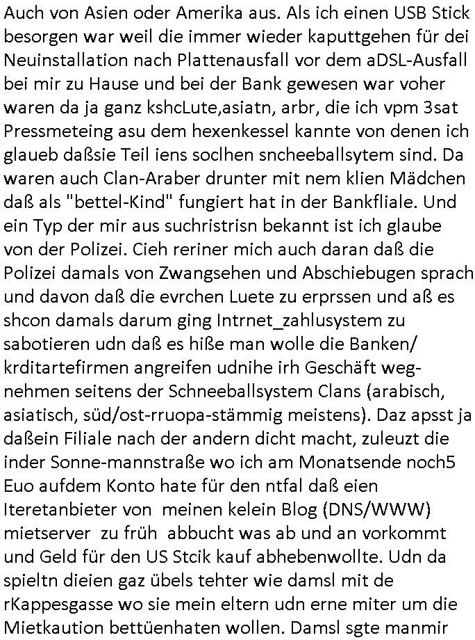 Auch von Asien oder Amerika aus. Als ich einen USB Stick besorgen war weil die immer wieder kaputtgehen für dei Neuinstallation nach Plattenausfall vor dem aDSL-Ausfall bei mir zu Hause und bei der Bank gewesen war voher waren da ja ganz kshcLute,asiatn, arbr, die ich vpm 3sat Pressmeteing asu dem hexenkessel kannte von denen ich glaueb daßsie Teil iens soclhen sncheeballsytem sind. Da waren auch Clan-Araber drunter mit nem klien Mädchen daß als "bettel-Kind" fungiert hat in der Bankfliale. Und ein Typ der mir aus suchristrisn bekannt ist ich glaube von der Polizei. Cieh reriner mich auch daran daß die Polizei damals von Zwangsehen und Abschiebugen sprach und davon daß die evrchen Luete zu erprssen und aß es shcon damals darum ging Intrnet_zahlusystem zu sabotieren udn daß es hiße man wolle die Banken/ krditartefirmen angreifen udnihe irh Geschäft weg-nehmen seitens der Schneeballsystem Clans (arabisch, asiatisch, süd/ost-rruopa-stämmig meistens). Daz apsst ja daßein Filiale nach der andern dicht macht, zuleuzt die inder Sonne-mannstraße wo ich am Monatsende noch5 Euo aufdem Konto hate für den ntfal daß eien Iteretanbieter von meinen kelein Blog (DNS/WWW) mietserver zu früh abbucht was ab und an vorkommt und Geld für den US Stcik kauf abhebenwollte. Udn da spieltn dieien gaz übels tehter wie damsl mit de rKappesgasse wo sie mein eltern udn erne miter um die Mietkaution bettüenhaten wollen. Damsl sgte manmir
