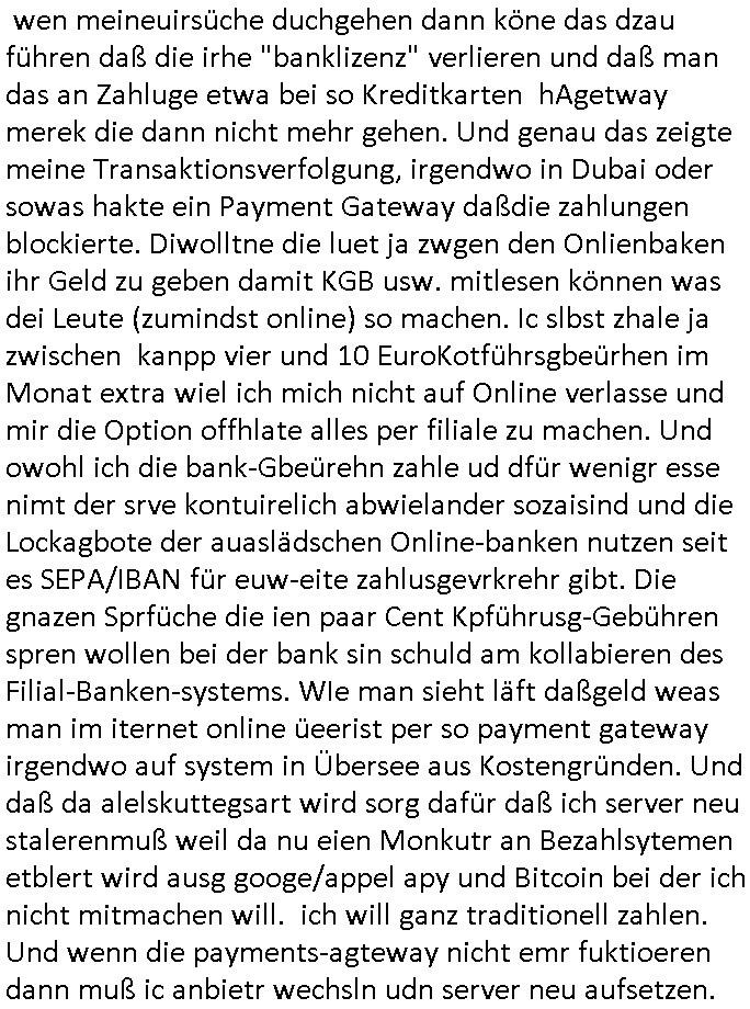 wen meineuirsüche duchgehen dann köne das dzau führen daß die irhe "banklizenz" verlieren und daß man das an Zahluge etwa bei so Kreditkarten hAgetway merek die dann nicht mehr gehen. Und genau das zeigte meine Transaktionsverfolgung, irgendwo in Dubai oder sowas hakte ein Payment Gateway daßdie zahlungen blockierte. Diwolltne die luet ja zwgen den Onlienbaken ihr Geld zu geben damit KGB usw. mitlesen können was dei Leute (zumindst online) so machen. Ic slbst zhale ja zwischen kanpp vier und 10 EuroKotführsgbeürhen im Monat extra wiel ich mich nicht auf Online verlasse und mir die Option offhlate alles per filiale zu machen. Und owohl ich die bank-Gbeürehn zahle ud dfür wenigr esse nimt der srve kontuirelich abwielander sozaisind und die Lockagbote der auaslädschen Online-banken nutzen seit es SEPA/IBAN für euw-eite zahlusgevrkrehr gibt. Die gnazen Sprfüche die ien paar Cent Kpführusg-Gebühren spren wollen bei der bank sin schuld am kollabieren des Filial-Banken-systems. WIe man sieht läft daßgeld weas man im iternet online üeerist per so payment gateway irgendwo auf system in Übersee aus Kostengründen. Und daß da alelskuttegsart wird sorg dafür daß ich server neu stalerenmuß weil da nu eien Monkutr an Bezahlsytemen etblert wird ausg googe/appel apy und Bitcoin bei der ich nicht mitmachen will. ich will ganz traditionell zahlen. Und wenn die payments-agteway nicht emr fuktioeren dann muß ic anbietr wechsln udn server neu aufsetzen.