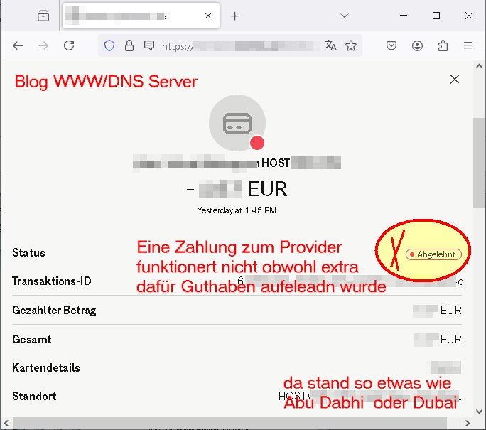 Wow, es geht immer so weiter: seit mir Cyberkriminelle mit Fake-Provider/Virenscanner - Rechnungen das Konto leerräumen wollten hab ich mir für sicher zahlungen eine Prepaid Online Zhalugsgewaty Zugang besorgt um meine Miet-Server vom Blog bezahlen zu können. Dort lade ich dann Geld auf über so eine Bon mit einer Auflade-nummer wie fürs handy wie man ihn an Kiosken erhält. Damit ist der maximale Schden den man nsicht könnet wenn man das hackt begrenzt auf den aufgeladenen Geldbetrag, das sind stets weniger als 25 Euro, es gibt keine "größeren" Aufladekarten. Seit vorgestren zickt nun dieses Payment Gateway herum, wie ich shcon inde rvraganheit ab und zu aber diesmal ist es schlimer. Denn um sich ds geld von dort zu holen nurtzen wirdum die Intrent-Provider-Shops ebenflls Zahlugsbawicklings-Gateways. Und in einem von denen hakt es gerade richtg heftig was ich mitbekomme da ich für mein DNS das aus Sicherheitsgründen mehr als einen kleinen VPS-Miet-Server für 5-10 Euro/Monat nutze also bei unter-schiedluchen Providern ribgs um den Globus aktiv bin (Vermidung von Zesur) und daher aus-schließen kann daß es sich um ein Problem beim Internet-Server-Provider handelt. Schinabrveruche Googe-pay/Apple-pay marktanteil zu erobern von den traditionellen Systemen die es seit denAnafagstagen des iternet gibt und stören. Kein Wunder so man Drirtanbieter app fürs Smartphone üer den "google play" store rubterladen muß für Android.