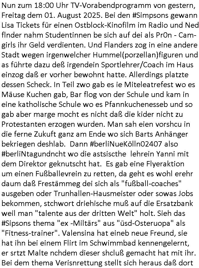 Nun zum 18:00 Uhr TV-Vorabendprogramm von gestern, Freitag dem 01. August 2025. Bei den #Simpsons gewann Lisa Tickets für einen Ostblock-Kinofilm im Radio und Ned flnder nahm Studentinnen be sich auf dei als Pr0n - Cam-girls ihr Geld verdienten. Und Flanders zog in eine andere Stadt wegen irgenwelcher Hummel(porzellan)figuren und as führte dazu deß irgendein Sportlehrer/Coach im Haus einzog daß er vorher bewohnt hatte. Allerdings platzte dessen Scheck. In Teil zwo gab es ie Miteleatrefest wo es Mäuse Kuchen gab, Bar flog von der Schule und kam in eine katholische Schule wo es Pfannkuchenesseb und so gab aber marge mocht es nicht daß die kider nicht zu Protestanten erzogen wurden. Man sah eien vorshcu in die ferne Zukuft ganz am Ende wo sich Barts Anhänger bekriegen deshlab. Dann #berliNueKölln02407 also #berliNtagundncht wo die astsiscthe lehrein Yanni mit dem Direktor geknutscht hat. Es gab eine Flyeraktion um einen Fußballevrein zu retten, da geht es wohl erehr daum daß Frestämmeg dei sich als "fußball-coaches" ausgeben oder Trunhallen-Hausmeister oder sowas Jobs bekommen, stchwort driehische muß auf die Ersatzbank weil man "talente aus der dritten Welt" holt. Sieh das #Sipsons thema "ex -Miltärs" aus "üsd-Osteruopa" als "Fitness-trainer". Valensina hat eineb neue Freund, sie hat ihn bei einem Flirt im Schwimmbad kennengelernt, er srtzt Malte nchdem dieser shcluß gemacht hat mit ihr. Bei dem thema Verisnrettung stellt sich heraus daß dort