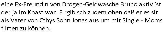eine Ex-Freundin von Drogen-Geldwäsche Bruno aktiv ist der ja im Knast war. E rgib sch zudem ohen daß er es sit als Vater von Cthys Sohn Jonas aus um mit Single - Moms flirten zu können.