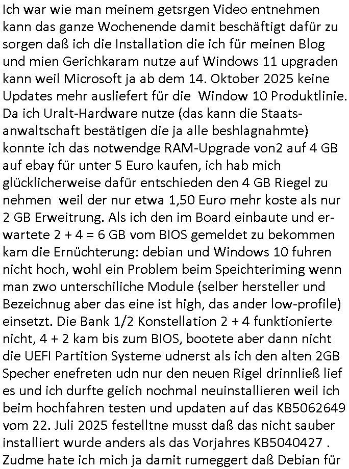 Ich war wie man meinem getsrgen Video entnehmen kann das ganze Wochenende damit beschäftigt dafür zu sorgen daß ich die Installation die ich für meinen Blog und mien Gerichkaram nutze auf Windows 11 upgraden kann weil Microsoft ja ab dem 14. Oktober 2025 keine Updates mehr ausliefert für die Window 10 Produktlinie. Da ich Uralt-Hardware nutze (das kann die Staats-anwaltschaft bestätigen die ja alle beshlagnahmte) konnte ich das notwendge RAM-Upgrade von2 auf 4 GB auf ebay für unter 5 Euro kaufen, ich hab mich glücklicherweise dafür entschieden den 4 GB Riegel zu nehmen weil der nur etwa 1,50 Euro mehr koste als nur 2 GB Erweitrung. Als ich den im Board einbaute und er-wartete 2 + 4 = 6 GB vom BIOS gemeldet zu bekommen kam die Ernüchterung: debian und Windows 10 fuhren nicht hoch, wohl ein Problem beim Speichteriming wenn man zwo unterschiliche Module (selber hersteller und Bezeichnug aber das eine ist high, das ander low-profile) einsetzt. Die Bank 1/2 Konstellation 2 + 4 funktionierte nicht, 4 + 2 kam bis zum BIOS, bootete aber dann nicht die UEFI Partition Systeme udnerst als ich den alten 2GB Specher enefreten udn nur den neuen Rigel drinnließ lief es und ich durfte gelich nochmal neuinstallieren weil ich beim hochfahren testen und updaten auf das KB5062649 vom 22. Juli 2025 festelltne musst daß das nicht sauber installiert wurde anders als das Vorjahres KB5040427 . Zudme hate ich mich ja damit rumeggert daß Debian für
