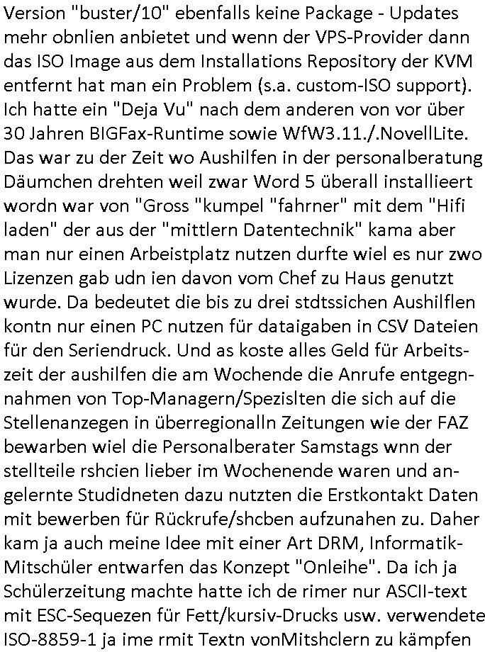 Version "buster/10" ebenfalls keine Package - Updates mehr obnlien anbietet und wenn der VPS-Provider dann das ISO Image aus dem Installations Repository der KVM entfernt hat man ein Problem (s.a. custom-ISO support). Ich hatte ein "Deja Vu" nach dem anderen von vor über 30 Jahren BIGFax-Runtime sowie WfW3.11./.NovellLite. Das war zu der Zeit wo Aushilfen in der personalberatung Däumchen drehten weil zwar Word 5 überall installieert wordn war von "Gross "kumpel "fahrner" mit dem "Hifi laden" der aus der "mittlern Datentechnik" kama aber man nur einen Arbeistplatz nutzen durfte wiel es nur zwo Lizenzen gab udn ien davon vom Chef zu Haus genutzt wurde. Da bedeutet die bis zu drei stdtssichen Aushilflen kontn nur einen PC nutzen für dataigaben in CSV Dateien für den Seriendruck. Und as koste alles Geld für Arbeits-zeit der aushilfen die am Wochende die Anrufe entgegn-nahmen von Top-Managern/Spezislten die sich auf die Stellenanzegen in überregionalln Zeitungen wie der FAZ bewarben wiel die Personalberater Samstags wnn der stellteile rshcien lieber im Wochenende waren und an- gelernte Studidneten dazu nutzten die Erstkontakt Daten mit bewerben für Rückrufe/shcben aufzunahen zu. Daher kam ja auch meine Idee mit einer Art DRM, Informatik-Mitschüler entwarfen das Konzept "Onleihe". Da ich ja Schülerzeitung machte hatte ich de rimer nur ASCII-text mit ESC-Sequezen für Fett/kursiv-Drucks usw. verwendete ISO-8859-1 ja ime rmit Textn vonMitshclern zu kämpfen