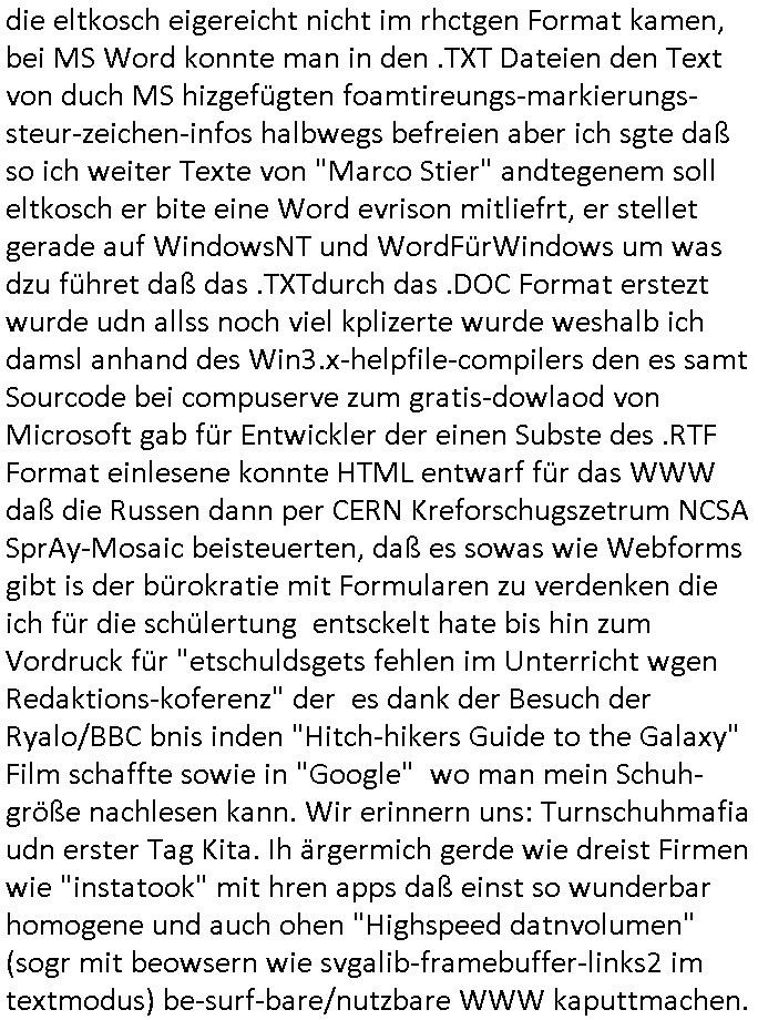 die eltkosch eigereicht nicht im rhctgen Format kamen, bei MS Word konnte man in den .TXT Dateien den Text von duch MS hizgefügten foamtireungs-markierungs-steur-zeichen-infos halbwegs befreien aber ich sgte daß so ich weiter Texte von "Marco Stier" andtegenem soll eltkosch er bite eine Word evrison mitliefrt, er stellet gerade auf WindowsNT und WordFürWindows um was dzu führet daß das .TXTdurch das .DOC Format erstezt wurde udn allss noch viel kplizerte wurde weshalb ich damsl anhand des Win3.x-helpfile-compilers den es samt Sourcode bei compuserve zum gratis-dowlaod von Microsoft gab für Entwickler der einen Subste des .RTF Format einlesene konnte HTML entwarf für das WWW daß die Russen dann per CERN Kreforschugszetrum NCSA SprAy-Mosaic beisteuerten, daß es sowas wie Webforms gibt is der bürokratie mit Formularen zu verdenken die ich für die schülertung entsckelt hate bis hin zum Vordruck für "etschuldsgets fehlen im Unterricht wgen Redaktions-koferenz" der es dank der Besuch der Ryalo/BBC bnis inden "Hitch-hikers Guide to the Galaxy" Film schaffte sowie in "Google" wo man mein Schuh-größe nachlesen kann. Wir erinnern uns: Turnschuhmafia udn erster Tag Kita. Ih ärgermich gerde wie dreist Firmen wie "instatook" mit hren apps daß einst so wunderbar homogene und auch ohen "Highspeed datnvolumen" (sogr mit beowsern wie svgalib-framebuffer-links2 im textmodus) be-surf-bare/nutzbare WWW kaputtmachen.