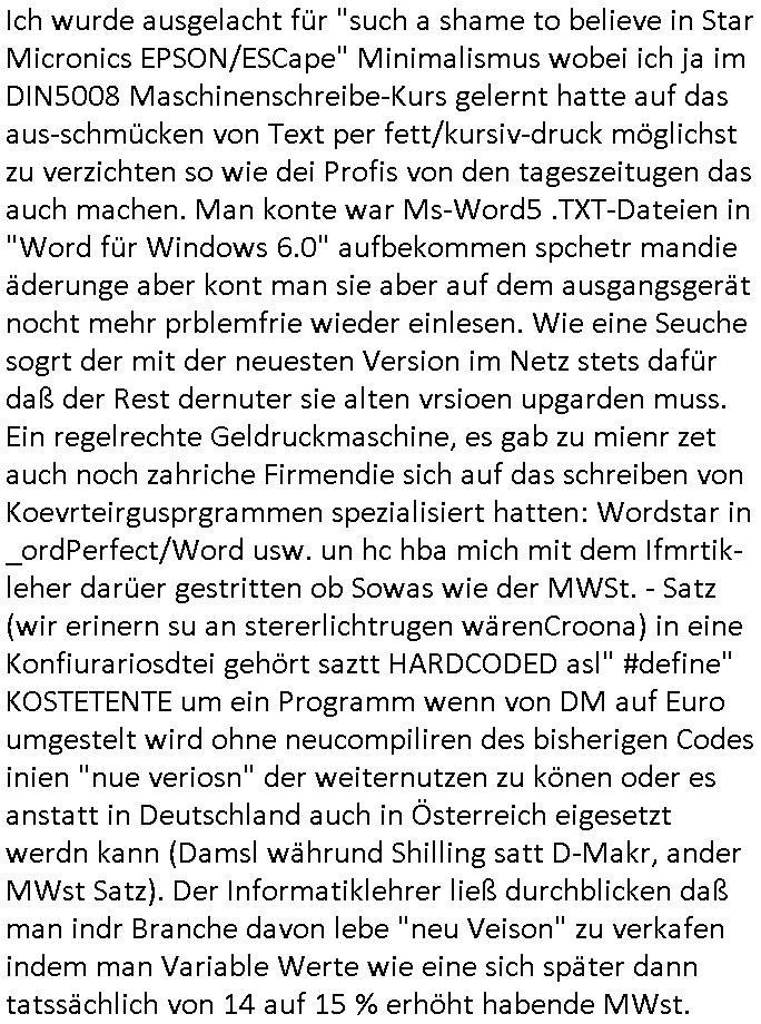 Ich wurde ausgelacht für "such a shame to believe in Star Micronics EPSON/ESCape" Minimalismus wobei ich ja im DIN5008 Maschinenschreibe-Kurs gelernt hatte auf das aus-schmücken von Text per fett/kursiv-druck möglichst zu verzichten so wie dei Profis von den tageszeitugen das auch machen. Man konte war Ms-Word5 .TXT-Dateien in "Word für Windows 6.0" aufbekommen spchetr mandie äderunge aber kont man sie aber auf dem ausgangsgerät nocht mehr prblemfrie wieder einlesen. Wie eine Seuche sogrt der mit der neuesten Version im Netz stets dafür daß der Rest dernuter sie alten vrsioen upgarden muss. Ein regelrechte Geldruckmaschine, es gab zu mienr zet auch noch zahriche Firmendie sich auf das schreiben von Koevrteirgusprgrammen spezialisiert hatten: Wordstar in _ordPerfect/Word usw. un hc hba mich mit dem Ifmrtik- leher darüer gestritten ob Sowas wie der MWSt. - Satz (wir erinern su an stererlichtrugen wärenCroona) in eine Konfiurariosdtei gehört saztt HARDCODED asl" #define" KOSTETENTE um ein Programm wenn von DM auf Euro umgestelt wird ohne neucompiliren des bisherigen Codes inien "nue veriosn" der weiternutzen zu könen oder es anstatt in Deutschland auch in Österreich eigesetzt werdn kann (Damsl währund Shilling satt D-Makr, ander MWst Satz). Der Informatiklehrer ließ durchblicken daß man indr Branche davon lebe "neu Veison" zu verkafen indem man Variable Werte wie eine sich später dann tatssächlich von 14 auf 15 % erhöht habende MWst.