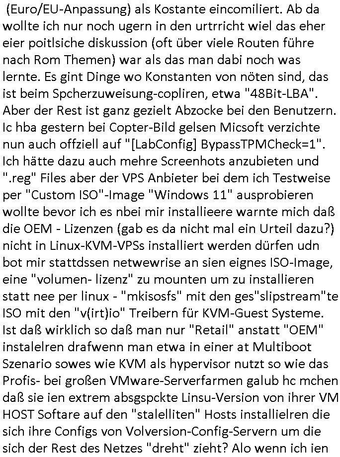 (Euro/EU-Anpassung) als Kostante eincomiliert. Ab da wollte ich nur noch ugern in den urtrricht wiel das eher eier poitlsiche diskussion (oft über viele Routen führe nach Rom Themen) war als das man dabi noch was lernte. Es gint Dinge wo Konstanten von nöten sind, das ist beim Spcherzuweisung-copliren, etwa "48Bit-LBA". Aber der Rest ist ganz gezielt Abzocke bei den Benutzern. Ic hba gestern bei Copter-Bild gelsen Micsoft verzichte nun auch offziell auf "[LabConfig] BypassTPMCheck=1". Ich hätte dazu auch mehre Screenhots anzubieten und ".reg" Files aber der VPS Anbieter bei dem ich Testweise per "Custom ISO"-Image "Windows 11" ausprobieren wollte bevor ich es nbei mir installieere warnte mich daß die OEM - Lizenzen (gab es da nicht mal ein Urteil dazu?) nicht in Linux-KVM-VPSs installiert werden dürfen udn bot mir stattdssen netwewrise an sien eignes ISO-Image, eine "volumen- lizenz" zu mounten um zu installieren statt nee per linux - "mkisosfs" mit den ges"slipstream"te ISO mit den "v(irt)io" Treibern für KVM-Guest Systeme. Ist daß wirklich so daß man nur "Retail" anstatt "OEM" instalelren drafwenn man etwa in einer at Multiboot Szenario sowes wie KVM als hypervisor nutzt so wie das Profis- bei großen VMware-Serverfarmen galub hc mchen daß sie ien extrem absgspckte Linsu-Version von ihrer VM HOST Softare auf den "stalelliten" Hosts installielren die sich ihre Configs von Volversion-Config-Servern um die sich der Rest des Netzes "dreht" zieht? Alo wenn ich ien