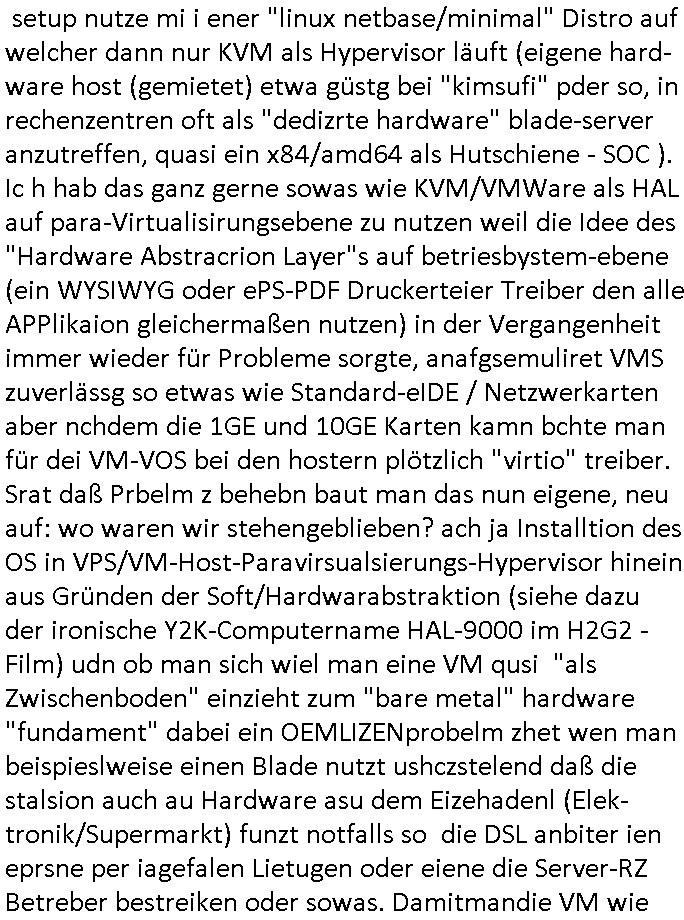 setup nutze mi i ener "linux netbase/minimal" Distro auf welcher dann nur KVM als Hypervisor läuft (eigene hard-ware host (gemietet) etwa güstg bei "kimsufi" pder so, in rechenzentren oft als "dedizrte hardware" blade-server anzutreffen, quasi ein x84/amd64 als Hutschiene - SOC ). Ic h hab das ganz gerne sowas wie KVM/VMWare als HAL auf para-Virtualisirungsebene zu nutzen weil die Idee des "Hardware Abstracrion Layer"s auf betriesbystem-ebene (ein WYSIWYG oder ePS-PDF Druckerteier Treiber den alle APPlikaion gleichermaßen nutzen) in der Vergangenheit immer wieder für Probleme sorgte, anafgsemuliret VMS zuverlässg so etwas wie Standard-eIDE / Netzwerkarten aber nchdem die 1GE und 10GE Karten kamn bchte man für dei VM-VOS bei den hostern plötzlich "virtio" treiber. Srat daß Prbelm z behebn baut man das nun eigene, neu auf: wo waren wir stehengeblieben? ach ja Installtion des OS in VPS/VM-Host-Paravirsualsierungs-Hypervisor hinein aus Gründen der Soft/Hardwarabstraktion (siehe dazu der ironische Y2K-Computername HAL-9000 im H2G2 - Film) udn ob man sich wiel man eine VM qusi "als Zwischenboden" einzieht zum "bare metal" hardware "fundament" dabei ein OEMLIZENprobelm zhet wen man beispieslweise einen Blade nutzt ushczstelend daß die stalsion auch au Hardware asu dem Eizehadenl (Elek-tronik/Supermarkt) funzt notfalls so die DSL anbiter ien eprsne per iagefalen Lietugen oder eiene die Server-RZ Betreber bestreiken oder sowas. Damitmandie VM wie