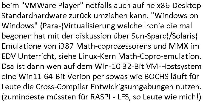 beim "VMWare Player" notfalls auch auf ne x86-Desktop Standardhardware zurück umziehen kann. "Windows on Windows" (Para-)Virtualisierung welche Ironie die mal begonen hat mit der diskussion über Sun-Sparc(/Solaris) Emulatione von i387 Math-coprozessorens und MMX im EDV Unterricht, siehe Linux-Kern Math-Copro-emulation. Dsa ist dann wen auf dem Win-10 32-Bit VM-Hostsystem eine Win11 64-Bit Verion per sowas wie BOCHS läuft für Leute die Cross-Compiler Entwickigsumgebungen nutzen. (zumindeste müssten für RASPI - LFS, so Leute wie mich!)