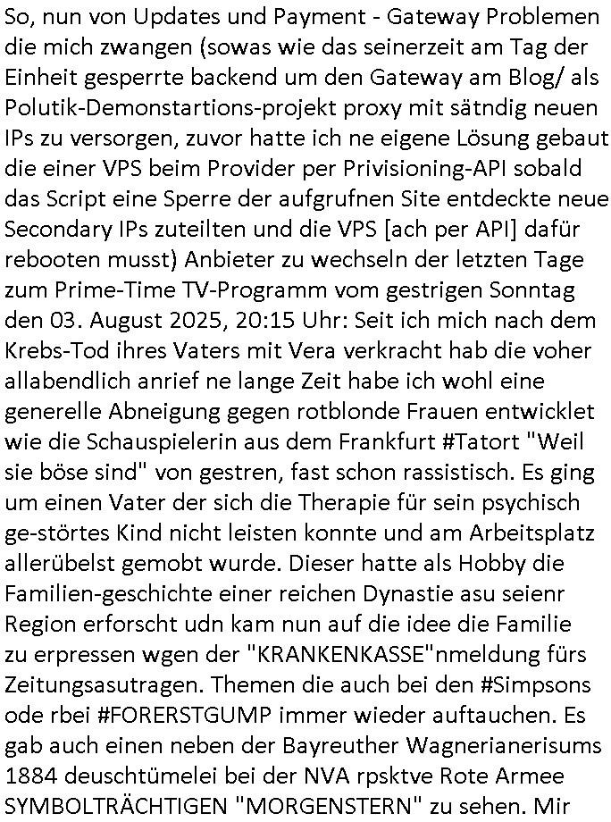 So, nun von Updates und Payment - Gateway Problemen die mich zwangen (sowas wie das seinerzeit am Tag der Einheit gesperrte backend um den Gateway am Blog/ als Polutik-Demonstartions-projekt proxy mit sätndig neuen IPs zu versorgen, zuvor hatte ich ne eigene Lösung gebaut die einer VPS beim Provider per Privisioning-API sobald das Script eine Sperre der aufgrufnen Site entdeckte neue Secondary IPs zuteilten und die VPS [ach per API] dafür rebooten musst) Anbieter zu wechseln der letzten Tage zum Prime-Time TV-Programm vom gestrigen Sonntag den 03. August 2025, 20:15 Uhr: Seit ich mich nach dem Krebs-Tod ihres Vaters mit Vera verkracht hab die voher allabendlich anrief ne lange Zeit habe ich wohl eine generelle Abneigung gegen rotblonde Frauen entwicklet wie die Schauspielerin aus dem Frankfurt #Tatort "Weil sie böse sind" von gestren, fast schon rassistisch. Es ging um einen Vater der sich die Therapie für sein psychisch ge-störtes Kind nicht leisten konnte und am Arbeitsplatz allerübelst gemobt wurde. Dieser hatte als Hobby die Familien-geschichte einer reichen Dynastie asu seienr Region erforscht udn kam nun auf die idee die Familie zu erpressen wgen der "KRANKENKASSE"nmeldung fürs Zeitungsasutragen. Themen die auch bei den #Simpsons ode rbei #FORERSTGUMP immer wieder auftauchen. Es gab auch einen neben der Bayreuther Wagnerianerisums 1884 deuschtümelei bei der NVA rpsktve Rote Armee SYMBOLTRÄCHTIGEN "MORGENSTERN" zu sehen. Mir