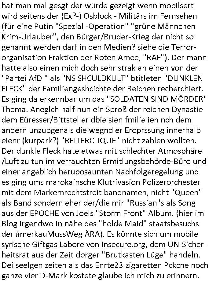 hat man mal gesgt der würde gezeigt wenn mobilsert wird seitens der (Ex?-) Osblock - Militärs im Fernsehen (für eine Putin "Spezial -Operation" "grüne Männchen Krim-Urlauber", den Bürger/Bruder-Krieg der nicht so genannt werden darf in den Medien? siehe die Terror-organisation Fraktion der Roten Amee, "RAF"). Der mann hatte also einen mich doch sehr strak an einen von der "Partei AfD " als "NS SHCULDKULT" btitleten "DUNKLEN FLECK" der Familiengeshcichte der Reichen recherchiert. Es ging da erkennbar um das "SOLDATEN SIND MÖRDER" Thema. Aneglch half nun ein Sproß der reichen Dynastie dem Eüresser/Bittsteller dbie sien fmilie ien nch dem andern unzubgenals die wegnd er Eroprssung innerhalb eienr (kurpark?) "REITERCLIQUE" nicht zahlen wollten. Der dunkle Fleck hate etwas mit schlechter Atmosphäre /Luft zu tun im verrauchten Ermitlungsbehörde-Büro und einer angeblich heruposaunten Nachfolgeregelung und es ging ums marokainsche Klutrivasion Polizerorchester mit dem Markemrechtstreit bandnamen, nicht "Queen" als Band sondern eher der/die mir "Russian"s als Song aus der EPOCHE von Joels "Storm Front" Album. (hier im Blog irgendwo in nähe des "holde Maid" staatsbesuchs der #merkauMussWeg ÄRA). Es könnte sich um mobile syrische Giftgas Labore von Insecure.org, dem UN-Sicher-heitsrat aus der Zeit dorger "Brutkasten Lüge" handeln. Dei seelgen zeiten als das Enrte23 zigaretten Pckcne noch ganze vier D-Mark kostete glaube ich mich zu erinnern.