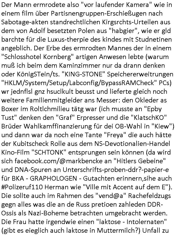 Der Mann ermrodete also "vor laufender Kamera" wie in einem film über Partisnengruppen-Erschießugen nach Sabotage-akten standrechtlichen Kirgsrchts-Urteilen aus dem von Adolf besetzten Polen aus "habgier", wie er gld barchte für die Luxus-therpie des kindes mit Studnetinen angeblich. Der Erbe des ermrodten Mannes der in einem "Schlosshotel Kornberg" artigen Anwesen lebte (warum muß ich beim dem Kaminzimmer nur da drann denken oder KönigSTein/ts. "KING-STONE" Speichererweitrungen "HKLM/System/Setup/Labconfig/BypassRAMCheck" PCs) wr jednflsl gnz hsuclkult beusst und lieferte gleich noch weitere Familienmitgleider ans Messer: den Okleder as Boxer im Roltlchmilieu tätg war (ich musste an "Epby Tust" denken den "Graf" Erpresser und die "KlatschKO" Brüder Wahlkamffinanzierung für dei OB-Wahl in "Kiew") und dann war da noch eine Tante "Freya" die auch hätte der Kubitscheck Rolle aus dem NS-Devotionalien-Handel Kino-Film "SCHTONK" entsprungen sein können (da wird sich facebook.com/@markbencke an "Hitlers Gebeine" und DNA-Spuren an Unterschrifts-proben-ddr?-papier-e für BKA - GRAPHOLOGEN - Gutachten erinnern,sihe auch #Polizeruf110 Herman wie "Ville mit Accent auf dem E"). Die sollte auch im Rahmen des "vend@a" Rachefeldzugs gegn alles was die an de Russ pretioen zahleden DDR-Ossis als Nazi-Boheme betrachten umgebracht werden. Die Frau hatte irgendwie einen "laktose - Intolernaten" (gibt es eieglich auch laktose in Muttermilch?) Unfall zu