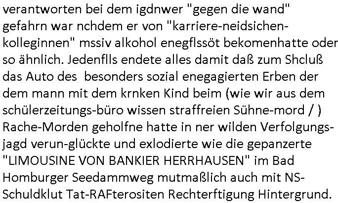 verantworten bei dem igdnwer "gegen die wand" gefahrn war nchdem er von "karriere-neidsichen-kolleginnen" mssiv alkohol enegflssöt bekomenhatte oder so ähnlich. Jedenflls endete alles damit daß zum Shcluß das Auto des besonders sozial enegagierten Erben der dem mann mit dem krnken Kind beim (wie wir aus dem schülerzeitungs-büro wissen straffreien Sühne-mord / ) Rache-Morden geholfne hatte in ner wilden Verfolgungs-jagd verun-glückte und exlodierte wie die gepanzerte "LIMOUSINE VON BANKIER HERRHAUSEN" im Bad Homburger Seedammweg mutmaßlich auch mit NS-Schuldklut Tat-RAFterositen Rechterftigung Hintergrund.