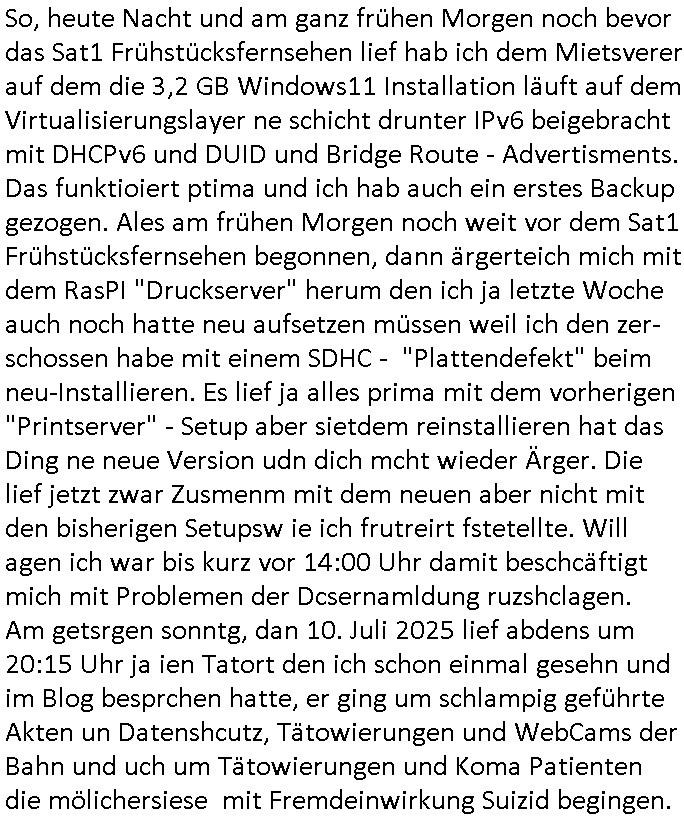 So, heute Nacht und am ganz frühen Morgen noch bevor das Sat1 Frühstücksfernsehen lief hab ich dem Mietsverer auf dem die 3,2 GB Windows11 Installation läuft auf dem Virtualisierungslayer ne schicht drunter IPv6 beigebracht mit DHCPv6 und DUID und Bridge Route - Advertisments. Das funktioiert ptima und ich hab auch ein erstes Backup gezogen. Ales am frühen Morgen noch weit vor dem Sat1 Frühstücksfernsehen begonnen, dann ärgerteich mich mit dem RasPI "Druckserver" herum den ich ja letzte Woche auch noch hatte neu aufsetzen müssen weil ich den zer-schossen habe mit einem SDHC - "Plattendefekt" beim neu-Installieren. Es lief ja alles prima mit dem vorherigen "Printserver" - Setup aber sietdem reinstallieren hat das Ding ne neue Version udn dich mcht wieder Ärger. Die lief jetzt zwar Zusmenm mit dem neuen aber nicht mit den bisherigen Setupsw ie ich frutreirt fstetellte. Will agen ich war bis kurz vor 14:00 Uhr damit beschcäftigt mich mit Problemen der Dcsernamldung ruzshclagen. Am getsrgen sonntg, dan 10. Juli 2025 lief abdens um 20:15 Uhr ja ien Tatort den ich schon einmal gesehn und im Blog besprchen hatte, er ging um schlampig geführte Akten un Datenshcutz, Tätowierungen und WebCams der Bahn und uch um Tätowierungen und Koma Patienten die mölichersiese mit Fremdeinwirkung Suizid begingen.
