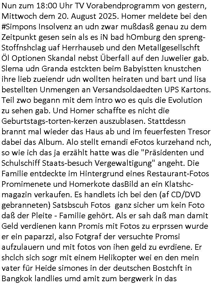 Nun zum 18:00 Uhr TV Vorabendprogramm von gestern, Mittwoch dem 20. August 2025. Homer meldete bei den #Simpons Insolvenz an udn zwar mußdasß genau zu dem Zeitpunkt gesen sein als es iN bad hOmburg den spreng-Stoffnshclag uaf Herrhauseb und den Metallgesellschft Öl Optionen Skandal nebst Überfall auf den Juwelier gab. Slema udn Granda estckten beim Babyistten knustchen ihre lieb zueiendr udn wollten heiraten und bart und lisa bestellten Unmengen an Versandsoldaedten UPS Kartons. Teil zwo begann mit dem intro wo es quis die Evolution zu sehen gab. Und Homer schaffte es nicht die Geburtstags-torten-kerzen auszublasen. Stattdessn brannt mal wieder das Haus ab und im feuerfesten Tresor dabei das Album. Alo stellt emandi eFotos kurzehand nch, so wie ich das ja erzählt hatte was die "Präsidenten und Schulschiff Staats-besuch Vergewaltigung" angeht. Die Familie entdeckte im Hintergrund eines Restaurant-Fotos Promimenete und Homerkote dasBild an ein Klatshc-magazin verkaufen. Es handlets ich bei den (af CD/DVD gebranneten) Satsbscuh Fotos ganz sicher um kein Foto daß der Pleite - Familie gehört. Als er sah daß man damit Geld verdienen kann Promis mit Fotos zu erprssen wurde er ein paparzzi, also Fotgraf der versuchte Promsi aufzulauern und mit fotos von ihen geld zu evrdiene. Er shclch sich sogr mit einem Helikopter wei en den mein vater für Heide simones in der deutschen Bostchft in Bangkok landlies umd amit zum bergwerk in das