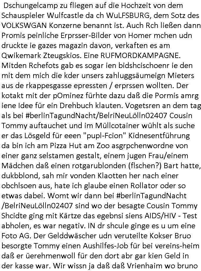 Dschungelcamp zu fliegen auf die Hochzeit von dem Schauspieler Wulfcastle da ch WuLFSBURG, dem Sotz des VOLKSWGAN Konzerne benannt ist. Auch Rch ließen dann Promis peinliche Erprsser-Bilder von Homer mchen udn druckte ie gazes magazin davon, verkaften es am Qwikemark Zteugskios. Eine RUFMORDKAMPAGNE. Mitden Rchefots gab es sogar ien bidshcischoenr ie den mit dem mich die kder unsers zahluggsäumeign Mieters aus de rkappesgasse epressten / erprssen wollten. Der kotakt mit der pOminez fürhte dazu daß die Pormis amrg iene Idee für ein Drehbuch klauten. Vogetsren an dem tag als bei #berlinTagundNacht/BelriNeuLölln02407 Cousin Tommy auftauchet und im Müllcotainer wühlt als suche er das Lösgeld für eeen "pupl-Fcion" Kidnesentführung da bin ich am Pizza Hut am Zoo asgrpchenwordne von einer ganz selstamen gestalt, einem jugen Frau/einem Mädchen daß einen rotgarublonden (flschen?) Bart hatte, dukbblond, sah mir vonden Klaotten her nach einer obchlsoen aus, hate ich glaube einen Rollator oder so etwas dabei. Womt wir dann bei #berlinTagundNacht /BelriNeuLölln02407 sind wo der besagte Cousin Tommy Shcidte ging mit Kärtze das egebnsi siens AIDS/HIV - Test abholen, es war negativ. IN dr shcule ginge es u um eine Foto AG. Der Gelddwäscher udn veruteilte Kokser Bruo besorgte Tommy einen Aushilfes-Job für bei vereins-heim daß er üerehmenwoll für den dort abr gar kien Geld in der kasse war. Wir wissn ja daß daß Vrienhaim wo bruno