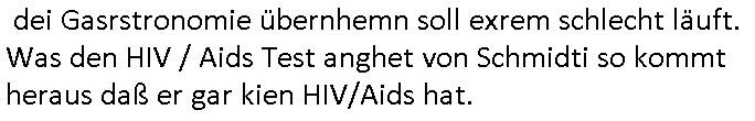 dei Gasrstronomie übernhemn soll exrem schlecht läuft. Was den HIV / Aids Test anghet von Schmidti so kommt heraus daß er gar kien HIV/Aids hat.