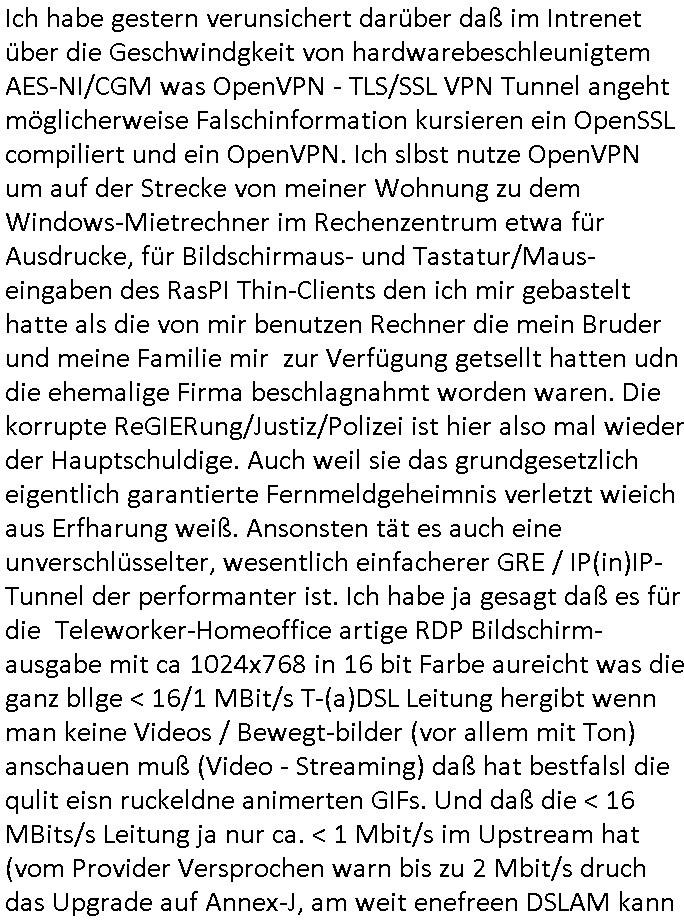 24.08.2025 04:00 Ich habe gestern verunsichert darüber daß im Intrenet über die Geschwindgkeit von hardwarebeschleunigtem AES-NI/CGM was OpenVPN - TLS/SSL VPN Tunnel angeht möglicherweise Falschinformation kursieren ein OpenSSL compiliert und ein OpenVPN. Ich slbst nutze OpenVPN um auf der Strecke von meiner Wohnung zu dem Windows-Mietrechner im Rechenzentrum etwa für Ausdrucke, für Bildschirmaus- und Tastatur/Maus-eingaben des RasPI Thin-Clients den ich mir gebastelt hatte als die von mir benutzen Rechner die mein Bruder und meine Familie mir zur Verfügung getsellt hatten udn die ehemalige Firma beschlagnahmt worden waren. Die korrupte ReGIERung/Justiz/Polizei ist hier also mal wieder der Hauptschuldige. Auch weil sie das grundgesetzlich eigentlich garantierte Fernmeldgeheimnis verletzt wieich aus Erfharung weiß. Ansonsten tät es auch eine unverschlüsselter, wesentlich einfacherer GRE / IP(in)IP-Tunnel der performanter ist. Ich habe ja gesagt daß es für die Teleworker-Homeoffice artige RDP Bildschirm-ausgabe mit ca 1024x768 in 16 bit Farbe aureicht was die ganz bllge < 16/1 MBit/s T-(a)DSL Leitung hergibt wenn man keine Videos / Bewegt-bilder (vor allem mit Ton) anschauen muß (Video - Streaming) daß hat bestfalsl die qulit eisn ruckeldne animerten GIFs. Und daß die < 16 MBits/s Leitung ja nur ca. < 1 Mbit/s im Upstream hat (vom Provider Versprochen warn bis zu 2 Mbit/s druch das Upgrade auf Annex-J, am weit enefreen DSLAM kann es nicht liegen, der graue Schltkasten von der Tlekom in dem die glasfasern enden steht nur wenige Meter neben dem Haus udn ich ich hab als man meine Leitung sabtierete temoprär 25m CAT5 kabel flegende durch Treppenhasu zum Anschcluß in den Keller gelegt udn auf dem die selben gshcnwindgeite bekommen wie durch den damslas gestörten Telefondraht vom Keller in meine Wohnung). Ich hate damsl sogra angereget dem vrmiter, einem Dachdecker vorzsuchalgen ein für Blitz- schlag unempfindlches LWL/Glasfaserkabel hinter der Regenrinne unsichtbar versteckt nach unten zu führen um es dann die 3-4 m unter der Einfahrt aufdem iege Grundtsück zum benachbarten grauen Schaltkasten der Telekom zu führen der wie gesagt nur wenige Meter entfernt steht und per Gals Ruchtung DeCIX Ring ange-bunden ist, 250 m von der Eruoüpäschn Zentralbnk EZB entfernt sollte ja genug GAsfaterKapaziät verbuddelt sein. Das ganze muß abndpbetensprsam genug sien daß ich notfals wenn das DSL-Kabel ausfällt auch über Mobilfunk (Highspeed Datenvolumen das geld koste, "gigabytes") in ienr stark fuktionsreduzierten Fassung weiterarbeiten kann. Und als das DSL Kabel tatsächlich ausfiel mal wieder vor einigen wochen hab ich bermekt wie lahm das Ausdrucken weiklichswerden kann wenn ich vom angemieteten Windows Recher aus zu Hause den Billigt Ducker be dem das naze gerät bilerg war als die nachfülltetenpatronen nutze. Daß ich den nutze daran ist auch die Polize schuld die mirbei eienr huasdurchsuchngs arten aktion imAugust 2015) das andere Gerät was ich mir von der Firma ausgeliehe um für die gerichts-prozess abristfähig zu sein und das ich als es altermsüde kaputt-geganeg war duch ien gebrucht gekauftes der gelciehn Preis-klasse ersetzt hatte kaputt machte funktionierte nicht mehr. Und um das Gerät vom ietrecher im Rhzetrum an dem per RAspi-Thinclient mein Montri, tatur ud amus hägen nutzen zu können muß es per VPN angebunden werden. Und da war mir währnd des Ausfalls aufgefallen wie lham das VPN werden kann wenn das Highspeed Datenvolumen des Mobiilfunktarfs aufgebraucht ist und man neues nachbachcen/kaufen muß. Daher habe ich mich mit der Geschwindigkiet von VPNs herumgschlagen. Und dshalb habe ich mir gestren ud vogestren bei einem Hoster Kapizät geeniet um zu compilieren und zu testen der Rhnzetren in mehren Ländern betreibt. Ohne VPN konnte ich da per IPerf Datenaten von etwa 1 Gbit/s errichen,mit PN warnes zwischen 45 und ca 95 Mbit/s. Und der ganze Hype um AES-GCM daß die CPU besser ausnutzt wen sie AES-NI ("AES" im /proc/cpuinfo hat) ist vollkomen üerbezgen, diemssugen ergabane daß das AES-GCM in der Parxis etwa gslchscnlel ist wei das von mir beist eingesettte AES-CBC udndaß der peformance- gewinn zu BF-CBC bei bestenfalls einem Dittel liegt. Die Vervierfachung der Datenrate die man verprochen hatte im Netz kann ich nicht nachvollziehen. Allerdinsgmuß man sehr aufapssn wenn man das nue OpenVPN copilert da bibt es ein satdsmäßg gstzte "DOWN-ROOT-PLUGIN" das als enabled gesetzt wird wenn man es im ./Configure nicht explizit abschaltet daß der Entikcler Community erlaubt per Rootkit den Rechner auf dem OpenVPN läuft zu kapern wenn man keine teure kommerzielle lizenz für das Produkt im priavten Hiem-/Hobby-einsatz kaufen will. Da ich ja extra nagmiete testsysteme nutzte ansatt der von mir asosnten eingestzten Produktivsysteme hab ich mir ds mal nsgcaut, egebnis. das root-user/passwort wird vonder sotare scheinbar überschrieben SSH deaktiviert. https://openvpn.net/community/ Version 2.6.14 https://build.openvpn.net/downloads/releases/ [0] "202508240400-0-1.jpg" [1] "202508240400-0-2.jpg" [2] "202508240400-0-3.jpg" [3] "202508240400-0-4.jpg" [4] "202508240400-0-5.jpg" [5] "202508240400-0-6.jpg" |