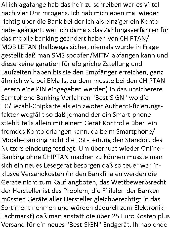 Al ich agafange hab das heir zu schreiben war es virtel nach vier Uhr mrogens. Ich hab mich eben mal wieder richtig über die Bank bei der ich als einziger ein Konto habe geärgert, weil ich damals das Zahlungsverfahren für das mobile banking geändert haben von CHIPTAN/ MOBILETAN (halbwegs sicher, niemals wurde in Frage gestellt daß man SMS spoofen/MITM abfangen kann und diese keine garatien für efolgriche Zstellung und Laufzeiten haben bis sie den Empfänger erreichen, ganz ähnlich wie bei EMails, zu-dem musste bei den CHIPTAN Lesern eine PIN eingegeben werden) in das unsicherere Samtphone Banking Verfahren "Best-SIGN" wo die EC/Bezahl-Chipkarte als ein zwoter Authenti-fizierungs-faktor wegfällt so daß jemand der ein Smart-phone stiehlt teils allein mit einem Gerät Kontrolle über ein fremdes Konto erlangen kann, da beim Smartphone/ Mobile-Banking nicht die DSL-Leitung den Standort des Nutzers eindeutg festlegt. Um überhuat wieder Online - Banking ohne CHIPTAN machen zu können musste man sich ein neues Lesegerät besorgen daß so teuer war in-klusve Versandkosten (in den Bankfilialen werden die Geräte nicht zum Kauf angboten, das Wettbewerbsrecht der Hersteller ist das Problem, die Fililalen der Banken müssten Geräte aller Hersteller gleichberechtigt in das Sortiment nehmen und würden dadurch zum Elektronik-Fachmarkt) daß man anstatt die über 25 Euro Kosten plus Versand für ein neues "Best-SIGN" Endgerät. Ih hab ende