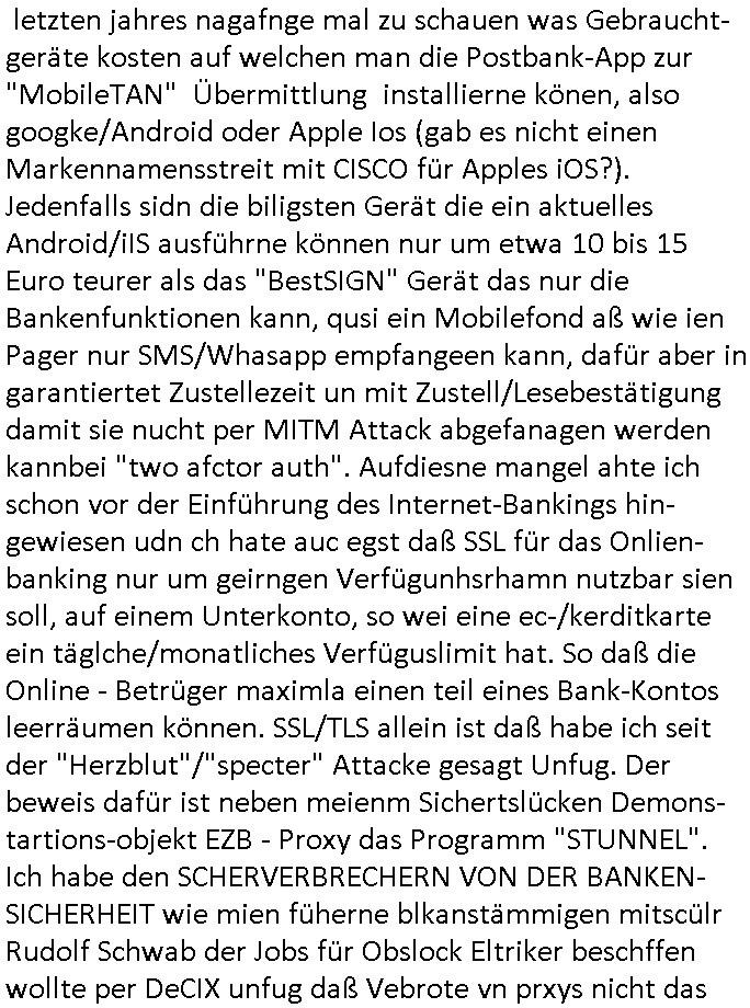 letzten jahres nagafnge mal zu schauen was Gebraucht-geräte kosten auf welchen man die Postbank-App zur "MobileTAN" Übermittlung installierne könen, also googke/Android oder Apple Ios (gab es nicht einen Markennamensstreit mit CISCO für Apples iOS?). Jedenfalls sidn die biligsten Gerät die ein aktuelles Android/iIS ausführne können nur um etwa 10 bis 15 Euro teurer als das "BestSIGN" Gerät das nur die Bankenfunktionen kann, qusi ein Mobilefond aß wie ien Pager nur SMS/Whasapp empfangeen kann, dafür aber in garantiertet Zustellezeit un mit Zustell/Lesebestätigung damit sie nucht per MITM Attack abgefanagen werden kannbei "two afctor auth". Aufdiesne mangel ahte ich schon vor der Einführung des Internet-Bankings hin-gewiesen udn ch hate auc egst daß SSL für das Onlien- banking nur um geirngen Verfügunhsrhamn nutzbar sien soll, auf einem Unterkonto, so wei eine ec-/kerditkarte ein täglche/monatliches Verfüguslimit hat. So daß die Online - Betrüger maximla einen teil eines Bank-Kontos leerräumen können. SSL/TLS allein ist daß habe ich seit der "Herzblut"/"specter" Attacke gesagt Unfug. Der beweis dafür ist neben meienm Sichertslücken Demons-tartions-objekt EZB - Proxy das Programm "STUNNEL". Ich habe den SCHERVERBRECHERN VON DER BANKEN-SICHERHEIT wie mien füherne blkanstämmigen mitscülr Rudolf Schwab der Jobs für Obslock Eltriker beschffen wollte per DeCIX unfug daß Vebrote vn prxys nicht das