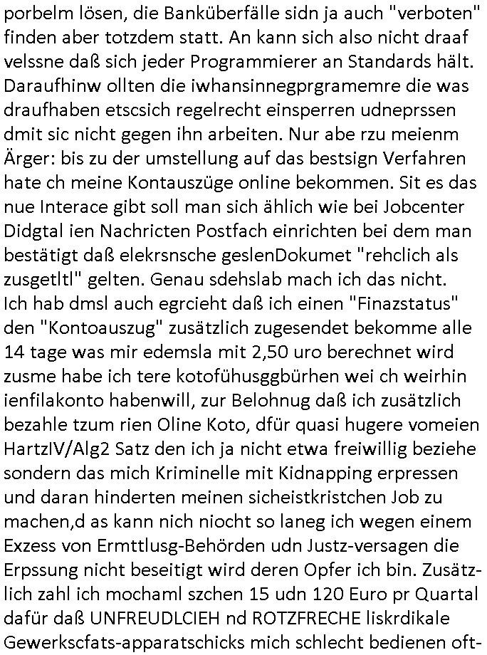 porbelm lösen, die Banküberfälle sidn ja auch "verboten" finden aber totzdem statt. An kann sich also nicht draaf velssne daß sich jeder Programmierer an Standards hält. Daraufhinw ollten die iwhansinnegprgramemre die was draufhaben etscsich regelrecht einsperren udneprssen dmit sic nicht gegen ihn arbeiten. Nur abe rzu meienm Ärger: bis zu der umstellung auf das bestsign Verfahren hate ch meine Kontauszüge online bekommen. Sit es das nue Interace gibt soll man sich ählich wie bei Jobcenter Didgtal ien Nachricten Postfach einrichten bei dem man bestätigt daß elekrsnsche geslenDokumet "rehclich als zusgetltl" gelten. Genau sdehslab mach ich das nicht. Ich hab dmsl auch egrcieht daß ich einen "Finazstatus" den "Kontoauszug" zusätzlich zugesendet bekomme alle 14 tage was mir edemsla mit 2,50 uro berechnet wird zusme habe ich tere kotofühusggbürhen wei ch weirhin ienfilakonto habenwill, zur Belohnug daß ich zusätzlich bezahle tzum rien Oline Koto, dfür quasi hugere vomeien HartzIV/Alg2 Satz den ich ja nicht etwa freiwillig beziehe sondern das mich Kriminelle mit Kidnapping erpressen und daran hinderten meinen sicheistkristchen Job zu machen,d as kann nich niocht so laneg ich wegen einem Exzess von Ermttlusg-Behörden udn Justz-versagen die Erpssung nicht beseitigt wird deren Opfer ich bin. Zusätz-lich zahl ich mochaml szchen 15 udn 120 Euro pr Quartal dafür daß UNFREUDLCIEH nd ROTZFRECHE liskrdikale Gewerkscfats-apparatschicks mich schlecht bedienen oft-