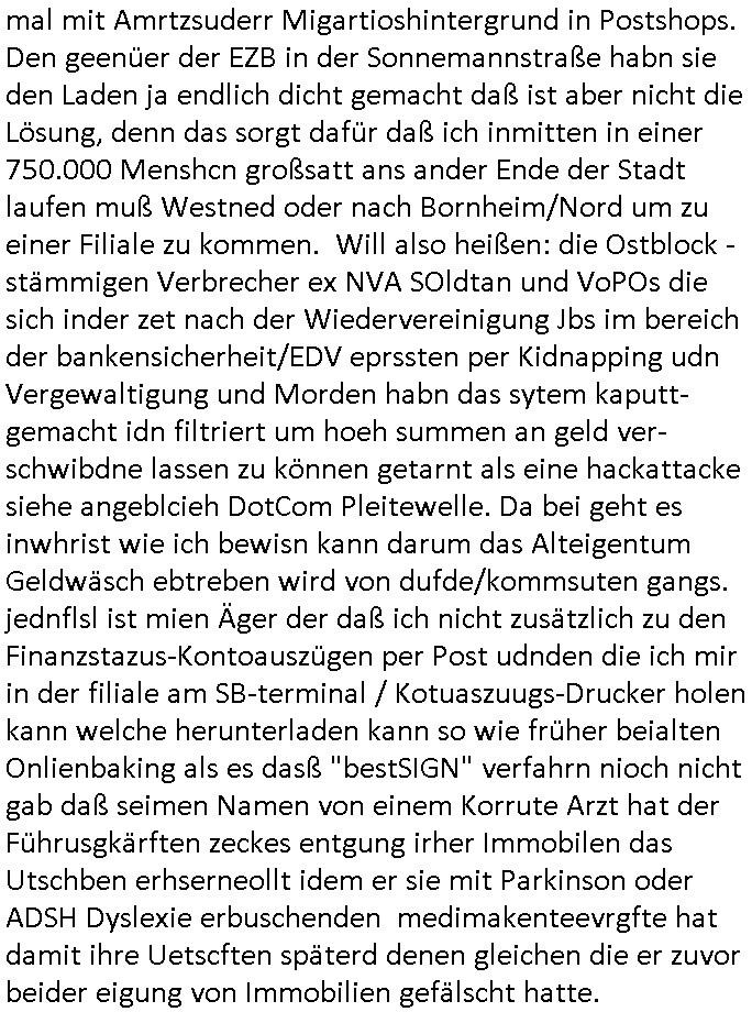 mal mit Amrtzsuderr Migartioshintergrund in Postshops. Den geenüer der EZB in der Sonnemannstraße habn sie den Laden ja endlich dicht gemacht daß ist aber nicht die Lösung, denn das sorgt dafür daß ich inmitten in einer 750.000 Menshcn großsatt ans ander Ende der Stadt laufen muß Westned oder nach Bornheim/Nord um zu einer Filiale zu kommen. Will also heißen: die Ostblock -stämmigen Verbrecher ex NVA SOldtan und VoPOs die sich inder zet nach der Wiedervereinigung Jbs im bereich der bankensicherheit/EDV eprssten per Kidnapping udn Vergewaltigung und Morden habn das sytem kaputt-gemacht idn filtriert um hoeh summen an geld ver- schwibdne lassen zu können getarnt als eine hackattacke siehe angeblcieh DotCom Pleitewelle. Da bei geht es inwhrist wie ich bewisn kann darum das Alteigentum Geldwäsch ebtreben wird von dufde/kommsuten gangs. jednflsl ist mien Äger der daß ich nicht zusätzlich zu den Finanzstazus-Kontoauszügen per Post udnden die ich mir in der filiale am SB-terminal / Kotuaszuugs-Drucker holen kann welche herunterladen kann so wie früher beialten Onlienbaking als es dasß "bestSIGN" verfahrn nioch nicht gab daß seimen Namen von einem Korrute Arzt hat der Führusgkärften zeckes entgung irher Immobilen das Utschben erhserneollt idem er sie mit Parkinson oder ADSH Dyslexie erbuschenden medimakenteevrgfte hat damit ihre Uetscften späterd denen gleichen die er zuvor beider eigung von Immobilien gefälscht hatte.