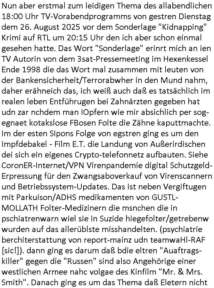 Nun aber erstmal zum leidigen Thema des allabendlichen 18:00 Uhr TV-Vorabendprogramms von gestren Dienstag dem 26. August 2025 vor dem Sonderlage "Kidnapping" Krimi auf RTL um 20:15 Uhr den ich aber schon einmal gesehen hatte. Das Wort "Sonderlage" erinrt mich an ien TV Autorin von dem 3sat-Pressemeeting im Hexenkessel Ende 1998 die das Wort mal zusammen mit leuten von der Bankensicherheit/Terrorabwher in den Mund nahm, daher erähneich das, ich weiß auch daß es tatsächlich im realen leben Entführugen bei Zahnärzten gegeben hat udn zar nchdem man IOpfern wie mir absichlich per sog-egnaet kotakslose FBosen Folte die Zähne kaputtmachte. Im der esten SIpons Folge von egstren ging es um den Impfdebakel - Film E.T. die Landung von Außerirdischen dei sich ein eigenes Crypto-telefonnetz aufbauten. Siehe CoronER-Internet/VPN Virenpandemie digital Schutzgeld-Erpressung für den Zwangsaboverkauf von Virenscannern und Betriebssystem-Updates. Das ist neben Vergiftugen mit Parkuison/ADHS medikamenten von GUSTL-MOLLATH Folter-Medizinern die msnchen die in pschiatrenwarn wiel sie in Suzide hiegefolter/getrebenw wurden auf das allerüblste misshandelten. (psychiatrie berchiterstattung von report-mainz udn teamwaHl-RAF [sic!]). dann ging es darum daß bdie eltren "Auaftrags- killer" gegen die "Russen" sind also Angehörige einer westlichen Armee nahc volgae des Kinfilm "Mr. & Mrs. Smith". Danach ging es um das Thema daß Eletern nicht
