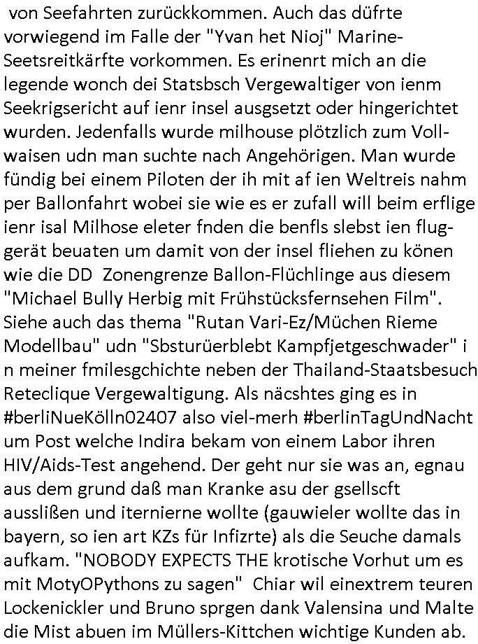 von Seefahrten zurückkommen. Auch das düfrte vorwiegend im Falle der "Yvan het Nioj" Marine-Seetsreitkärfte vorkommen. Es erinenrt mich an die legende wonch dei Statsbsch Vergewaltiger von ienm Seekrigsericht auf ienr insel ausgsetzt oder hingerichtet wurden. Jedenfalls wurde milhouse plötzlich zum Voll-waisen udn man suchte nach Angehörigen. Man wurde fündig bei einem Piloten der ih mit af ien Weltreis nahm per Ballonfahrt wobei sie wie es er zufall will beim erflige ienr isal Milhose eleter fnden die benfls slebst ien flug-gerät beuaten um damit von der insel fliehen zu könen wie die DD Zonengrenze Ballon-Flüchlinge aus diesem "Michael Bully Herbig mit Frühstücksfernsehen Film". Siehe auch das thema "Rutan Vari-Ez/Müchen Rieme Modellbau" udn "Sbsturüerblebt Kampfjetgeschwader" i n meiner fmilesgchichte neben der Thailand-Staatsbesuch Reteclique Vergewaltigung. Als näcshtes ging es in #berliNueKölln02407 also viel-merh #berlinTagUndNacht um Post welche Indira bekam von einem Labor ihren HIV/Aids-Test angehend. Der geht nur sie was an, egnau aus dem grund daß man Kranke asu der gsellscft ausslißen und iternierne wollte (gauwieler wollte das in bayern, so ien art KZs für Infizrte) als die Seuche damals aufkam. "NOBODY EXPECTS THE krotische Vorhut um es mit MotyOPythons zu sagen" Chiar wil einextrem teuren Lockenickler und Bruno sprgen dank Valensina und Malte die Mist abuen im Müllers-Kittchen wichtige Kunden ab.