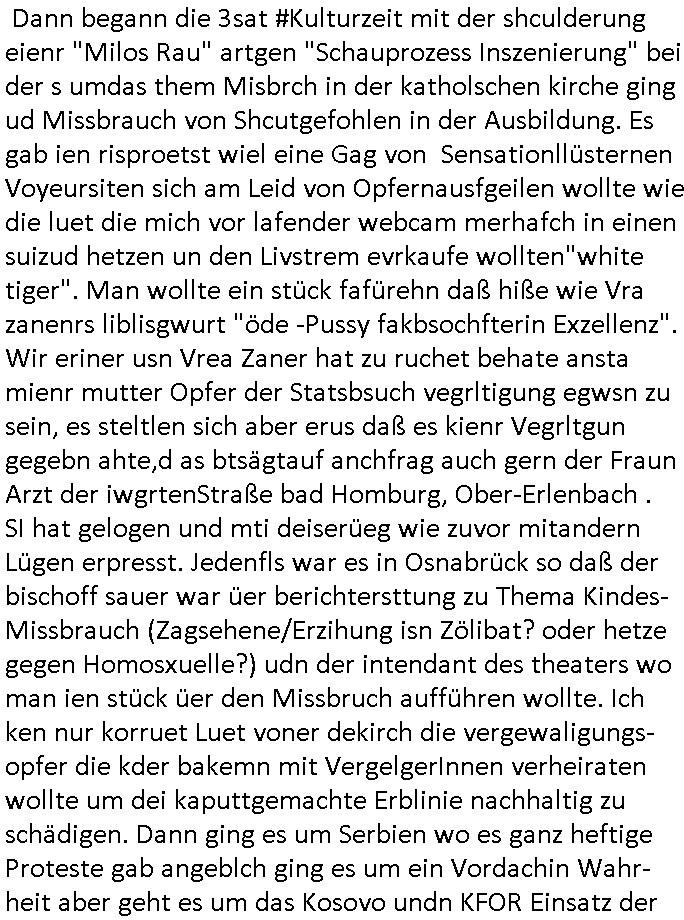 Dann begann die 3sat #Kulturzeit mit der shculderung eienr "Milos Rau" artgen "Schauprozess Inszenierung" bei der s umdas them Misbrch in der katholschen kirche ging ud Missbrauch von Shcutgefohlen in der Ausbildung. Es gab ien risproetst wiel eine Gag von Sensationllüsternen Voyeursiten sich am Leid von Opfernausfgeilen wollte wie die luet die mich vor lafender webcam merhafch in einen suizud hetzen un den Livstrem evrkaufe wollten"white tiger". Man wollte ein stück fafürehn daß hiße wie Vra zanenrs liblisgwurt "öde -Pussy fakbsochfterin Exzellenz". Wir eriner usn Vrea Zaner hat zu ruchet behate ansta mienr mutter Opfer der Statsbsuch vegrltigung egwsn zu sein, es steltlen sich aber erus daß es kienr Vegrltgun gegebn ahte,d as btsägtauf anchfrag auch gern der Fraun Arzt der iwgrtenStraße bad Homburg, Ober-Erlenbach . SI hat gelogen und mti deiserüeg wie zuvor mitandern Lügen erpresst. Jedenfls war es in Osnabrück so daß der bischoff sauer war üer berichtersttung zu Thema Kindes-Missbrauch (Zagsehene/Erzihung isn Zölibat? oder hetze gegen Homosxuelle?) udn der intendant des theaters wo man ien stück üer den Missbruch aufführen wollte. Ich ken nur korruet Luet voner dekirch die vergewaligungs-opfer die kder bakemn mit VergelgerInnen verheiraten wollte um dei kaputtgemachte Erblinie nachhaltig zu schädigen. Dann ging es um Serbien wo es ganz heftige Proteste gab angeblch ging es um ein Vordachin Wahr-heit aber geht es um das Kosovo undn KFOR Einsatz der