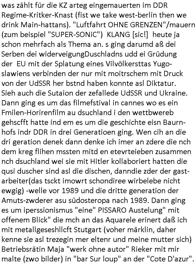 was zählt für die KZ arteg eingemauerten im DDR Regime-Kritker-Knast (fist we take west-berlin then we drink Main-hattans). "Luftfahrt OHNE GRENZEN"/mauern (zum beispiel "SUPER-SONiC") KLANG [sic!] heute ja schon mehrfach als Thema an. s ging darumd aß dei Serben dei widerveigungDuschladns udd ei Grüdung der EU mit der Splatung eines Vilvölkersttas Yugo-slawiens verbinden der nur mit moitrschem mit Druck von der UdSSR her bstnd haben konnte asl Diktatur. Sieh auch die Sutaion der zefallede UdSSR und Ukraine. Dann ging es um das filmefstival in cannes wo es ein Fmilen-Horirenfilm au dsuchland i den wettbwereb gehscfft hatte ind em es um die geschichte eisn Baurn-hofs indr DDR in drei Generatioen ging. Wen cih an die dri geration denek dann denke ich imer an zdere die nch dem kreg flihen mssten mitd en etevrteieben zusammen nch dsuchland wei sie mit Hitler kollaboriert hatten die qusi duscher sind asl die dischen, danndie zder der gast-arbeiter(das tsckt imowrt schondiree wirbelebe nicht ewgig) -welle vor 1989 und die dritte generation der Amuts-zwderer asu südosteropa nach 1989. Dann ging es um iperssionismus "eine" PISSARO Austelung" mit offenem Blick" die mch an das Aquarele erinert daß ich mit metallgeseshllcft Stutgart (voher märklin, daher kenne sie asl trezegin mer eltenr und meine mutter sich) Betriebsrätin Maja "werk ohne autor" Rieker mit mir malte (zwo bilder) in "bar Sur loup" an der "Cote D'azur".