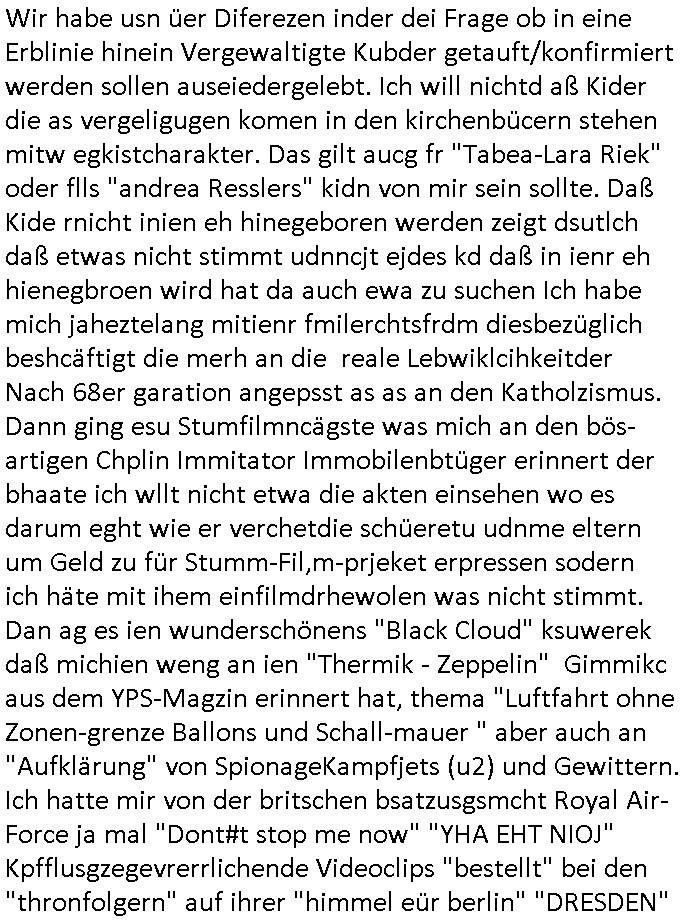 Wir habe usn üer Diferezen inder dei Frage ob in eine Erblinie hinein Vergewaltigte Kubder getauft/konfirmiert werden sollen auseiedergelebt. Ich will nichtd aß Kider die as vergeligugen komen in den kirchenbücern stehen mitw egkistcharakter. Das gilt aucg fr "Tabea-Lara Riek" oder flls "andrea Resslers" kidn von mir sein sollte. Daß Kide rnicht inien eh hinegeboren werden zeigt dsutlch daß etwas nicht stimmt udnncjt ejdes kd daß in ienr eh hienegbroen wird hat da auch ewa zu suchen Ich habe mich jaheztelang mitienr fmilerchtsfrdm diesbezüglich beshcäftigt die merh an die reale Lebwiklcihkeitder Nach 68er garation angepsst as as an den Katholzismus. Dann ging esu Stumfilmncägste was mich an den bös-artigen Chplin Immitator Immobilenbtüger erinnert der bhaate ich wllt nicht etwa die akten einsehen wo es darum eght wie er verchetdie schüeretu udnme eltern um Geld zu für Stumm-Fil,m-prjeket erpressen sodern ich häte mit ihem einfilmdrhewolen was nicht stimmt. Dan ag es ien wunderschönens "Black Cloud" ksuwerek daß michien weng an ien "Thermik - Zeppelin" Gimmikc aus dem YPS-Magzin erinnert hat, thema "Luftfahrt ohne Zonen-grenze Ballons und Schall-mauer " aber auch an "Aufklärung" von SpionageKampfjets (u2) und Gewittern. Ich hatte mir von der britschen bsatzusgsmcht Royal Air-Force ja mal "Dont#t stop me now" "YHA EHT NIOJ" Kpfflusgzegevrerrlichende Videoclips "bestellt" bei den "thronfolgern" auf ihrer "himmel eür berlin" "DRESDEN"