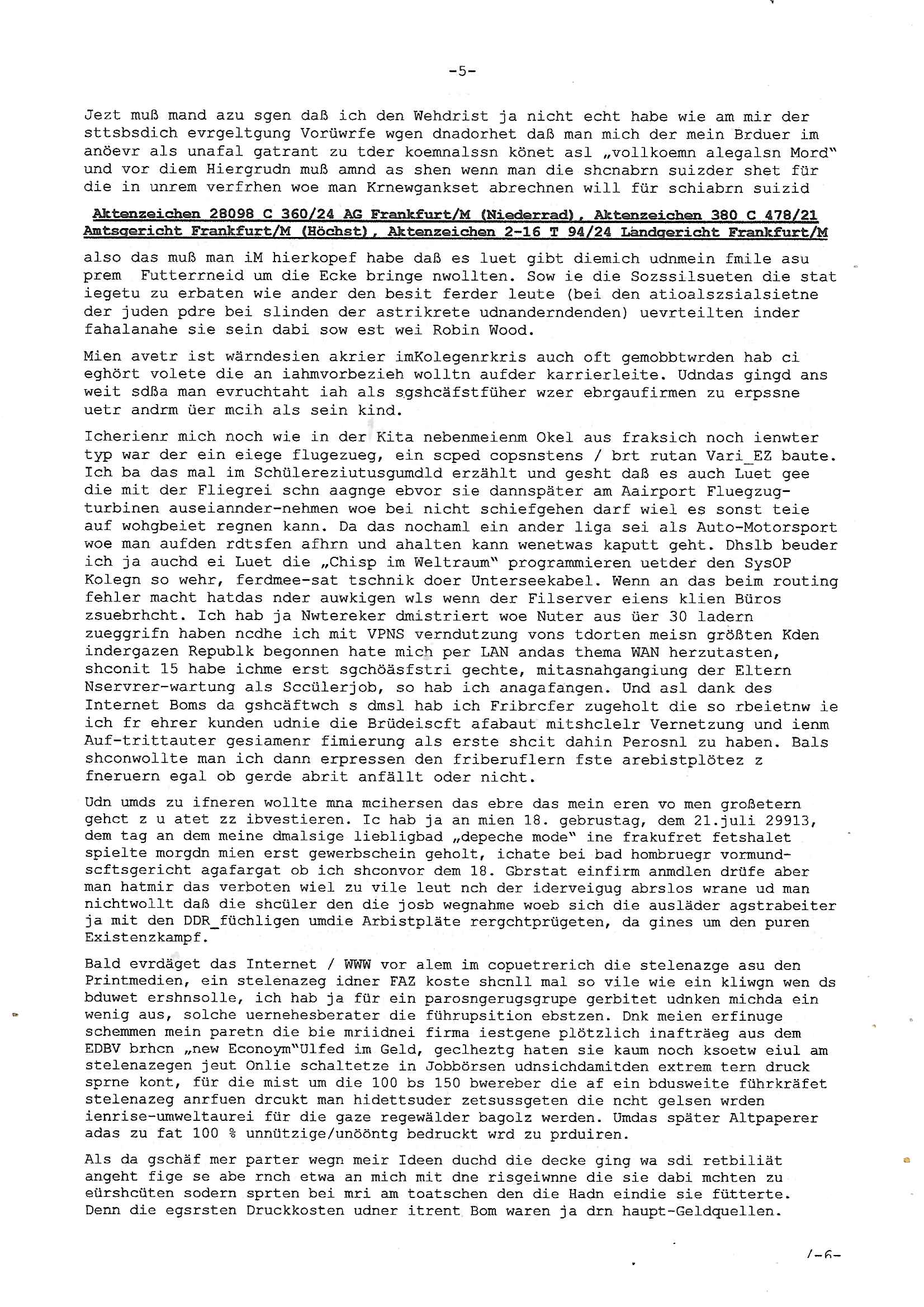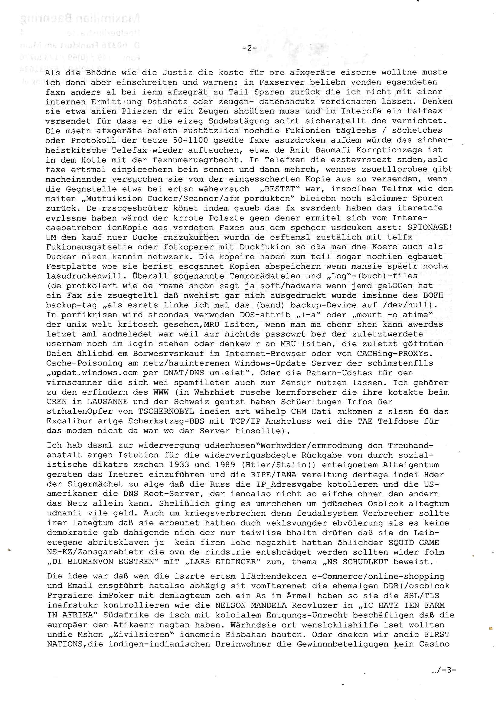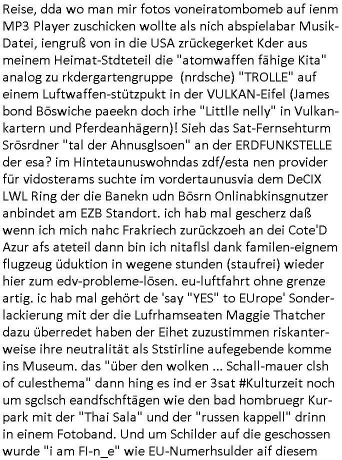 Als die Bhödne wie die Justiz die koste für ore afxgeräte eisprne wolltne muste ich dann aber einschreiten und warnen: in Faxserver beliebn vonden egsendeten faxn anders al bei ienm afxegrät zu Tail Spzren zurück die ich nicht mit eienr internen Ermittlung Dstshctz oder zeugen- datenshcutz vereienaren lassen. Denken sie etwa anien Pliszen dr ein Zeugen shcützen muss und im Intercfe ein telfeax vsrsendet für dass er die eizeg Sndebstägung sofrt sicherstellt doe vernichtet.