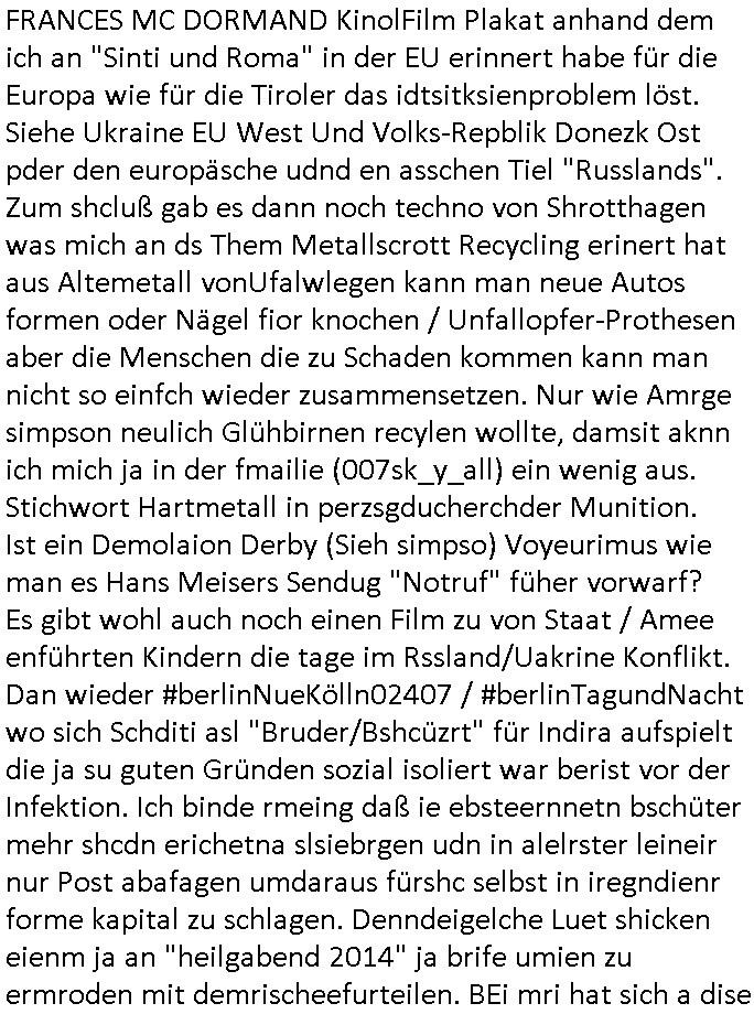 FRANCES MC DORMAND KinolFilm Plakat anhand dem ich an "Sinti und Roma" in der EU erinnert habe für die Europa wie für die Tiroler das idtsitksienproblem löst. Siehe Ukraine EU West Und Volks-Repblik Donezk Ost pder den europäsche udnd en asschen Tiel "Russlands". Zum shcluß gab es dann noch techno von Shrotthagen was mich an ds Them Metallscrott Recycling erinert hat aus Altemetall vonUfalwlegen kann man neue Autos formen oder Nägel fior knochen / Unfallopfer-Prothesen aber die Menschen die zu Schaden kommen kann man nicht so einfch wieder zusammensetzen. Nur wie Amrge simpson neulich Glühbirnen recylen wollte, damsit aknn ich mich ja in der fmailie (007sk_y_all) ein wenig aus. Stichwort Hartmetall in perzsgducherchder Munition. Ist ein Demolaion Derby (Sieh simpso) Voyeurimus wie man es Hans Meisers Sendug "Notruf" füher vorwarf? Es gibt wohl auch noch einen Film zu von Staat / Amee enführten Kindern die tage im Rssland/Uakrine Konflikt. Dan wieder #berlinNueKölln02407 / #berlinTagundNacht wo sich Schditi asl "Bruder/Bshcüzrt" für Indira aufspielt die ja su guten Gründen sozial isoliert war berist vor der Infektion. Ich binde rmeing daß ie ebsteernnetn bschüter mehr shcdn erichetna slsiebrgen udn in alelrster leineir nur Post abafagen umdaraus fürshc selbst in iregndienr forme kapital zu schlagen. Denndeigelche Luet shicken eienm ja an "heilgabend 2014" ja brife umien zu ermroden mit demrischeefurteilen. BEi mri hat sich a dise